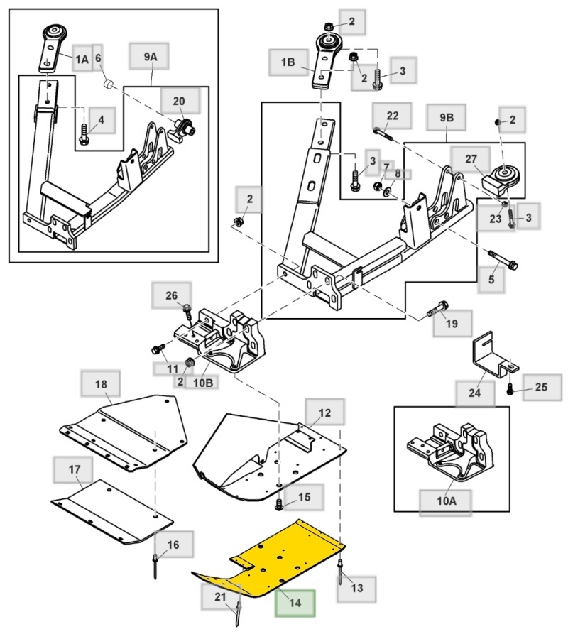 1A опора шарова стабілізатора жатки AH170774, AH206042 1B опора шарова стабілізатора жатки AH210858, AH210878 OR AH221021 OR AH221194 2 гайка М16 14M7291 3 болт М16х60 19M10822 4 болт М16х50 19M7794, AH206042 5 болт М16х130 19M7829 6 втулка A49465 7 гайка M16 A31869 8 шайба 11/16" X 1-1/2" X 0.105" 24H1192 9A стабілізатор жатки лівий AH210878, AH206042 OR AH221021 9B стабілізатор плаваючого ричага лівий AH225361, AH221194 9B стабілізатор плаваючого ричага лівий AH221194, AH221021 10A кронштейн H203906, H215074 10B кронштейн H215074 Remarks : ALSO ORDER H215589 618, H215588 620, H215587 622, H215586 625, H215584 630, H215585 635 11 болт М16х40 19M7793 12 пластина металева ліва AH203936 13 заклепка відривна 6.200 mm (0.244") HXE52669 14 захист лівий (пластиковий - під плавуючий ричаг) H204239, H203906 14 захист лівий (пластиковий) H218047, H215074 |