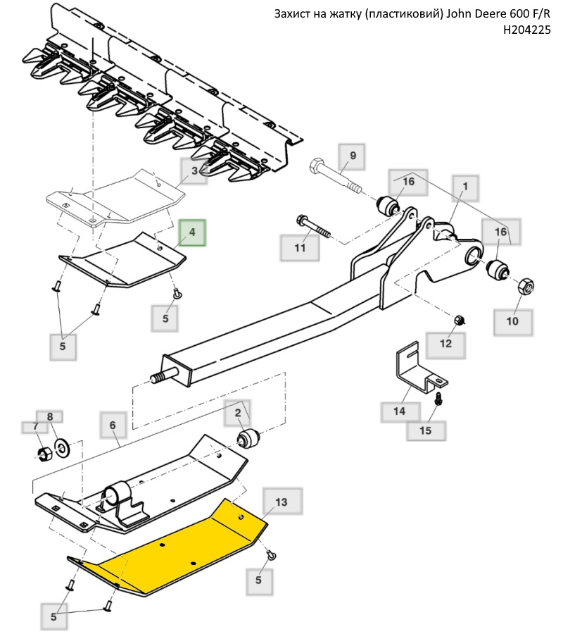 1 кронштейн AH220809 AH164238 OR AH212053 2 сайленблок AH154697 3 опорна пластина (металева) H204220 4 захист жатки (пластиковий) H204221 5 заклепка під молоток 1/4 Inch H150218 6 пластина опорна AH203962 7 гайка М16 14M7276 8 шайба 11/16" X 1-1/2" X 0.105" 24H1192 9 болт М12х150 H207478 10 гайка М12 14M7299 11 болт М10х70 19M7809 12 гайка М10 A51212 13 захист жатки (пластиковий) H204225 14 кронщтейн H204074 15 болт М10х20 37M7086 16 сайленблок AH230507 |
