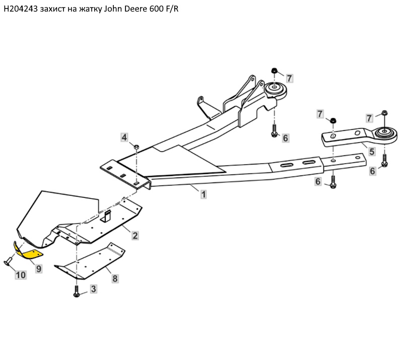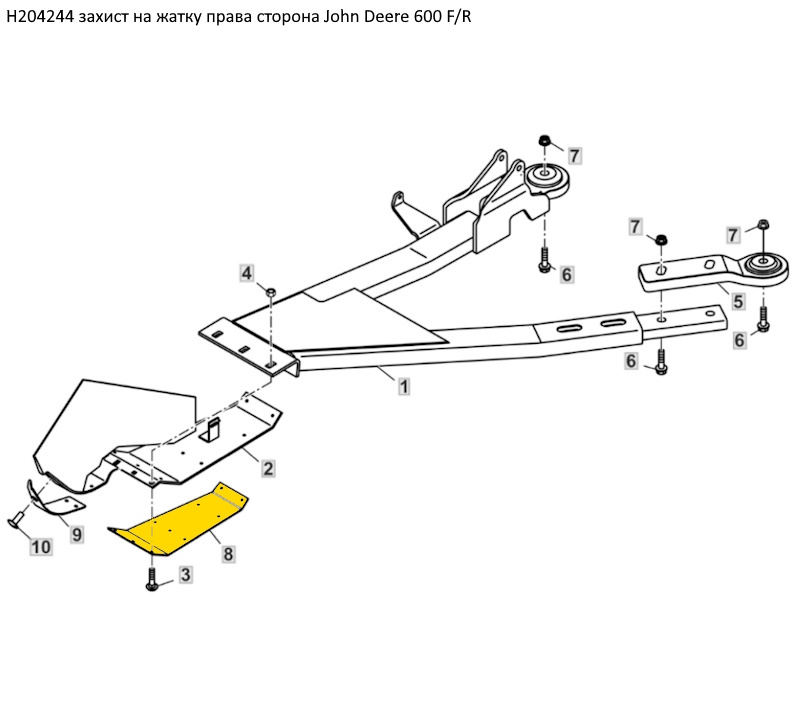 1 стабілізатор правий AH222855 2 пластина металева права AH225588 3 болт М10х40 03M7194 4 гайка М10 14M7296 5 шарнір стабілізатора жатки AH210858 6 болт М16х60 19M10822 7 гайка М16 14M7291 8 захист жатки правий (пластиковий) H204244 9 захист жатки правий (пластиковий) H204243 10 заклепка відривна HXE52669, H150109 |