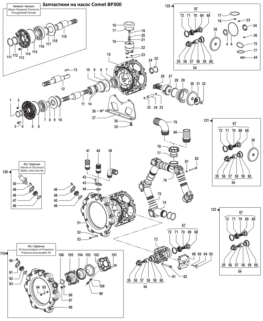 54 12200042 клапан насоса BP300 (нагнітальний) 55 12050032 корпус клапана 56 18020196 пружина клапана 57 36040027 тарілка клапана 58 12100107 кільце клапана 34,65х1,78 59 30090125 сідло клапана 60 12010069 кільце клапана 49х56,5х8,3 61 28110103 шайба 13х20х2,5 62 36090224 гинт М12х65 63 32020270 заглушка 64 36250046 гинт М5х12 65 28110129 шайба 5,3х15х1,2 66 04600044 захист кришки 67 12200090 клапан насоса BP300 (впускний) 68 30090173 сідло клапана 69 36040036 тарілка клапана 70 18020294 пружина клапана 71 12050049 корпус клапана 72 12010069 кільце клапана 73 32180425 кришка насоса 74 32130028 патрубок випускного колектора 75 12100635 кільце гумове 53х4,0 76 32120041 патрубок ипускного колектора (під фітінг) 77 12100387 кільце гумове 55,56х3,53 78 12000057 гайка 2"1/2 79 28010070 фітінг смоктуальний (кут.90 град.) 60мм 80 28000093 фітінг смоктуальний (прямий) 60мм 81 28110099 шайба 8,4х15х1,6 82 36090227 гинт М8х75 90 36090164 гинт М8х16 91 24040188 прижим напорного фітінга 92 32020352 фітінг перехідний 93 12100180 кільце гумове 29х3,0 94 36090169 гвинт М8х60 95 28110099 шайба 8,4х15х1,6 96 04150071 колектор нагнітальний (під поітряну камеру) 97 06040105 гайка М10 98 28110098 шайба 1,5х18х2 99 36100003 золотник поітряної камери 100 12090033 шайба 7,5х14х2 101 36070223 болт М10х65 102 00030015 кришка поітряної камери 103 18000034 мембрана поітряної камери 104 04600036 обмежумач поітряної камери 105 00020024 корпус повітряної камери 106 12100185 кільце гумове 38х4,0 110 05010198 колектор нагнітальний в зборі 120 12190054 клапан запобіжний зборі 121 50260358 ремкомплект насоса Comet BP300 (мембрани (гумові) + клапана) 121 50260359 ремкомплект насоса Comet BP300 (мембрани (десмопанові) + клапана) 122 50260360 ремкомплект насоса Comet BP300 (повний, мембрана гумова) 122 50260361 ремкомплект насоса Comet BP300 (повний, мембрана десмопанова) 123 50250048 ремкомплект насоса Comet BP300 (клапана) |