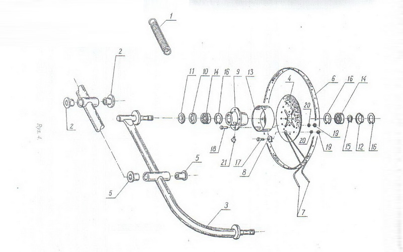 1 пружина ... (5240/00-001) 2 втулка велика ... (5240/00-002 або 8245-240-000-027) 3 рама колеса ... (5240/00-003 або 8245-240-000-30) 4 диск колеса ... (5240/00-004 або 8245-240-000-42) 5 втулка мала ... (5211/02-004 або 8245-211-020-049) 6 обод колеса ... (5211/02-009 або 8245-211-020-092) 7 пружина гребки ... (N-BN-67/1953-02 або 8245-499-042-017) 8 скоба крепления пружини ... (N-BN-69/1953-04 або 8249-499-049-021) 9 ступица ... (5214/00-032 або 8245-211-000-322) 10 манжета ... (5211/00-033 або 8245-211-000-335) 11 кришка захистна ... (5211/00-034 або 8245-211-000-348) 12 кришка захистна ... (5211/00-035 або 8245-211-000-350) 13 захистний кожух пластиковий ... (5211/00-003/0 або 8245-211-020-036) 14 підшипник 6205-2RS 15 кільце стопорне 25 на вал 16 кільце стопорне 52 в отвір 17 болт мебельний М10х30 18 болт ступиці М10х30 19 гайка М10 20 шайба 10мм 21 масльонка 1/8 45° |