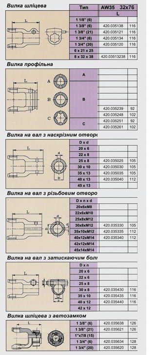 Карданні вали для сільскогосподарської техніки Хрестовини / Вилки карданного валу популярні розміри Хрестовина на поворотний шарнір Труби карданного валу Перехідник карданного валу Обгінна муфта Фрикційна муфта Запобіжна муфта |