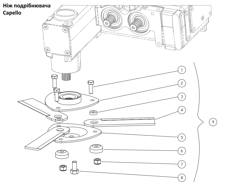 6 01.0213.00 ковпачок (захист гайки) 7 02.2032.00 гайка М12 8 01.0211.00 болт кріплення ножів 9 01.0943.00 комплект ножів в зборі |