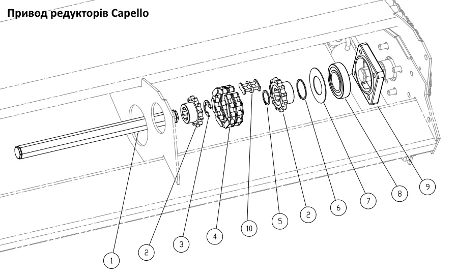 1 01.0878.00 вал шестигранний 650мм 2 01.0510.01 зірочка Z12 ASA 60 3 02.2085.00 кільце стопорне 4 03.4010.00 ланцюг ASA 60 5 04.5017.00 кільце регуліровочне E 30X1.5 |