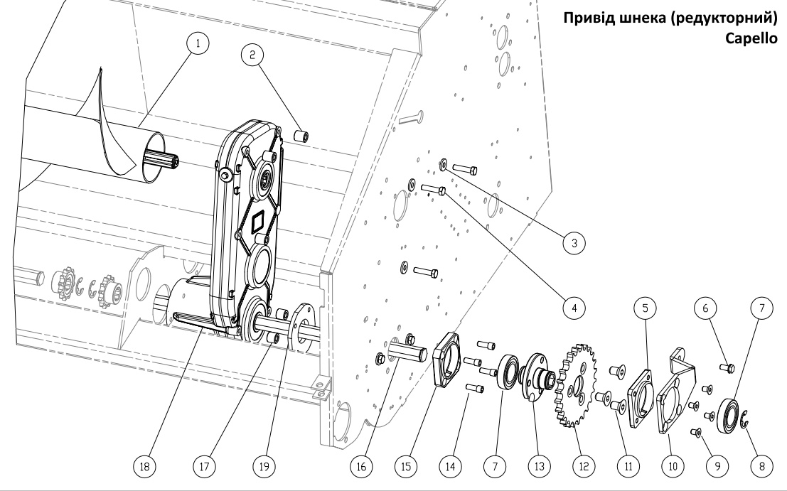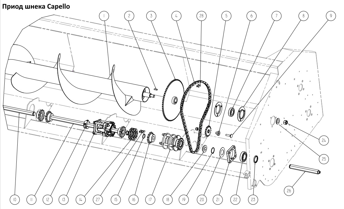 1 03.4235.00 шнек 2 02.2015.00 шпонка 10х8х40 3 01.0260.00 зірочка шнека Z68 5/8" 4 03.2029.01 ланцюг ASA 50 5 01.0657.00 зірочка натяжна Z17 5/8" 6 01.0648.00 вісь натяжної зірочки 7 03.2026.00 підшипник 1726207-2RS1 8 03.2025.00 корпус підшипника 9 02.2065.00 болт М12х60 10 01.1020.00 вал шестигранний 640мм 11 01.1025.00 вал шестигранний 500мм 12 01.0161.02 фіксатор 13 04.5119.02 муфта запобіжна приода редуктора 14 03.4010.00 ланцюг зєднувальний ASA60 |