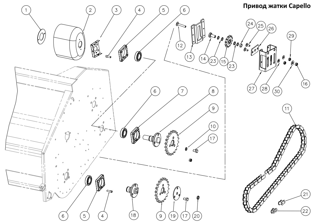 16 02.2003.00 гайка М14 17 02.1034.00 болт М16х25 18 01.0216.00 ступиця зірочки 19 01.0821.00 прижимна пластина 20 02.1012.00 гайка M20X1.5 21 03.2024.00 ланка з'єднувальна 22 03.2023.00 ланка перехідна 23 01.1605.00 шайба 24 01.1606.00 втулка 25 02.4481.00 болт мебельний 26 01.1661.00 пластина 27 01.1660.00 кронштейн 28 02.4485.00 шайба 29 02.2032.00 гайка 30 02.4484.00 шайба |