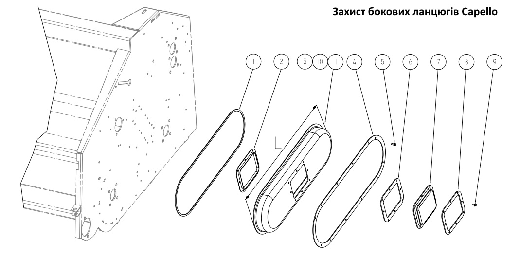 7 03.4076.00 ревезійна кришка 8 01.0926.00 прижимна планка 9 02.2026.00 болт М8х20 10 03.4181.00 корпус ланцюгів L=1080 11 03.4182.00 корпус ланцюгів L=1180 |