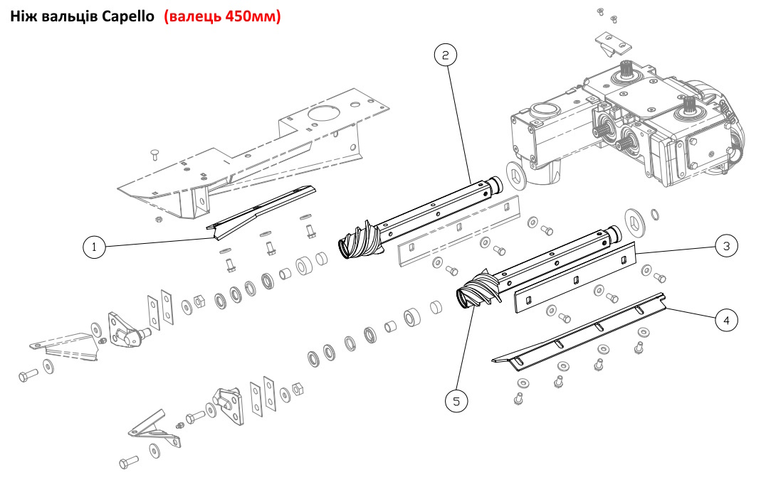 1 01.0955.00 пластина противоріжуча права 450мм 2 01.0200.01 валець правий 450мм 3 03.2019.00 ніж вальця 450мм 4 01.0953.00 пластина противоріжуча ліва 450мм 5 01.0201.01 валець лівий 450мм |