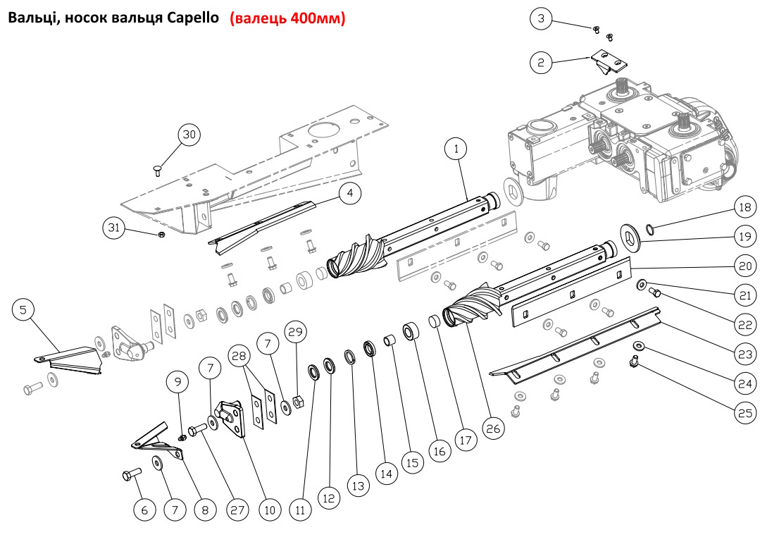 17 03.2095.00 втулка (заглушка) 18 02.1040.00 кільце гумове 19 03.2020.00 шайба вальця задня (пластикова) 20 03.4100.00 ніж вальця 400мм 21 02.2096.00 шайба 13X22X3 22 02.2094.00 болт M12X1.25X20 23 01.0953.00 пластина противоріжуча ліва 24 02.1036.00 шайба 11X40X3 25 02.1037.00 болт M10X30 26 01.0951.00 валець лівий 400мм 27 02.2002.00 болт M14X40 28 04.5112.00 пластина регулювання 29 02.1025.05 гайка М14 30 02.1000.00 болт мебельний M10X25 31 02.2020.00 гайка M10 |