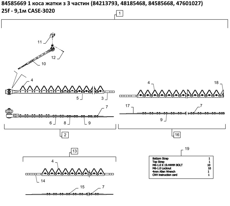 1 84585669 1 коса жатки з 3 частин (84213793, 48185468, 84585668, 47601027) 25f - 9,1м 3020 1 84585668 1 коса жатки з 3ч без головки (84213793, 48185468, 84585668, 47601027) 25f - 9,1м 3020 2 84585638 1 коси з головкою (перша частина - сегменти з мілкою насічкою) 2 84585637 1 коси з головкою (перша частина - сегменти з крупною насічкою) 3 84585680 1 полотно коси (перша частина 2,5м) 4 87728899 68 сегмент (мілка насічка) 44103700, 47980548 4 87728905 68 сегмент (крупна насічка) 84429103 5 321848A1 23 пластина коси фіксації 6 84429101 9 болт сегмента М6 x 28mm, Cl 10.9 7 84429102 128 гайка сегмента |