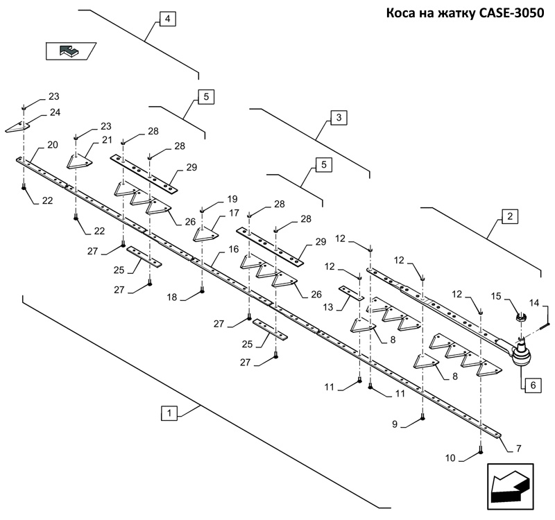 5 84519635 ремкомплект полотна ножа 47641531 6 84275287 головка коси 7 84588791 полотно коси (перша частина) 8 87728899 сегмент (мілкий зуб) 8 87728900 сегмент (крупний зуб) 9 84429100 болт сегмента М6x22mm (на жатку 4шт) 10 84429101 болт сегмента М6x28mm (на жатку 9шт) 11 87663841 болт сегмента М6x18mm 12 84429102 гайка сегмента 13 84588688 планка зєднуальна коси 14 10733901 шплінт пальця коси 15 87604453 гайка пальця коси 16 84588723 полотно коси (середня частина) 17 87728899 сегмент (мілкий зуб) 17 87728900 сегмент (крупний зуб) 18 84429099 болт сегмента М6 x 16mm 19 84429102 гайка сегмента 20 47531506 полотно коси (кінцева частина) 20 47532496 полотно коси (кінцева частина) 20 84588795 полотно коси (кінцева частина) 20 47532511 полотно коси (кінцева частина) 20 84588726 полотно коси (кінцева частина) 20 84588725 полотно коси (кінцева частина) 20 84588774 полотно коси (кінцева частина) 21 87728899 сегмент (з мілким зубом) 21 87728900 сегмент (з крупним зубом) 22 84429099 болт сегмента M6 x 16mm 23 84429102 гайка сегмента 24 84543491 сегмент кінцевий (гладкий) 87736076, 87736077 24 87736075 сегмент кінцевий (з мілким зубом) 47983318 25 84588790 планка зєднуальна коси (нижня) 26 87728899 сегмент (з мілким зубом) 47980548, 44103700 26 87728900 сегмент (з крупним зубом) 27 84429099 болт сегмента М6 x 16mm 28 47372139 гайка флянцева 29 84588781 планка зєднуальна коси (верхня) |