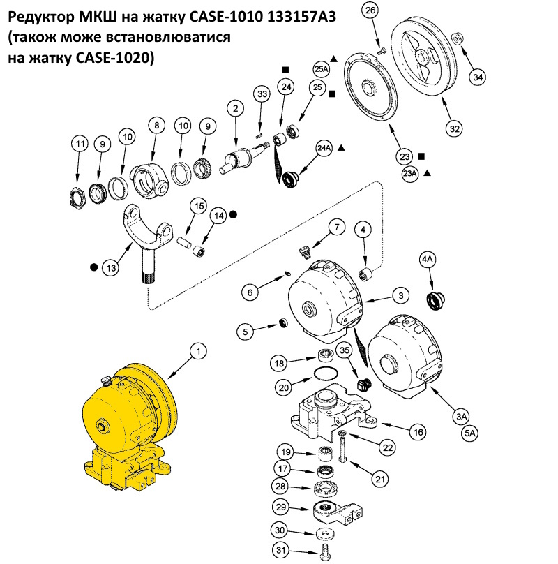 1 . . 133157A3 - редуктор МКШ на жатку CASE-1010 2 . . 182581A1 - вал МКШ 3 . . 130820A2 - корпус МКШ 3А . . 398816A1 - корпус редуктора МКШ 4 . . 140436A1 - підшипник 4А . . 394681A1 - підшипник 5 . . 544667R91 - сальник 6 . . 217-407 - штифт 3/8"-18 7 . . 219-436 - підшипник 3/8"-18 8 . . 62520C2 - корпус шатуна 9 . . 287902 - підшипник (внутрішня обойма LM104949) 10 . . 287066 - підшипник (зовнішня обойма LM104911) 11 . . 133466A1 - гайка вала МКШ 12 . . 130822A2 - вилка МКШ (в зборі з підшипниками) 13 . . 182580A1 - вилка МКШ 14 . . A12652 - підшипник 15 . . 141162A1 - палець вилки МКШ 16 . . 128962A1 - кронштейн (опора МКШ в зборі) 17 . . 101295C1 - сальник 18 . . 205369R91 - підшипник B-2610 |