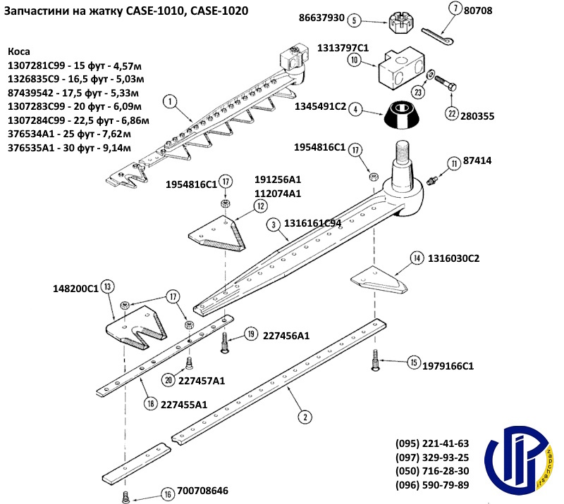 1 376534A3 - коса 7,62м 25 футів 3 1316161C94 - головка ножа 4 1345491C2 - захист пальця головни ножа 5 86637930 - гайка пальця 5/8"-18 7 80708 - шплінт 1/8" x 1 1/2" 10 1313797C1 - кронштейн головни ножа 12 112074A1 - сегмент 13 148200C1 - сегмент кінцевий 14 1316030C2 - сегмент кінцевий 15 1979166C1 - болт сегмента (головки ножа) 16 700708646 - болт сегмента 17 1954816C1 - гайка сегмента 18 227455A1 - планка зєднання коси 19 227456A1 - болт сегмента 20 227457A1 - болт сегмента 21 227213A1 - ремкомплект (поз.17,18,19,20) 22 280355 - болт кріплення головки ножа 5/8"-11 x 2 1/4" 23 396-21066 - шайба 21/32" x 1 5/16" x 0,150" |