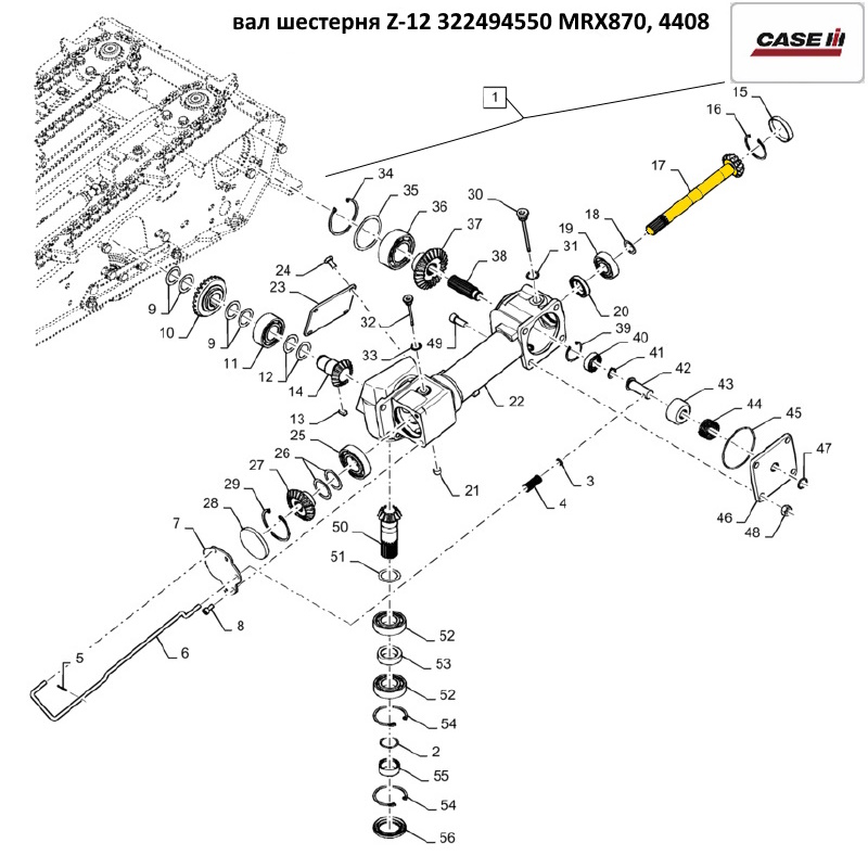 28 322493050 заглушка 29 11067976 кільце стопорне W80 30 322645750 щуп 31 322498950 шайба мідна 22х28х1,5 32 322645850 щуп 33 322645950 шайба мідна 17х22х1,5 34 11062176 кільце стопорне W85 35 322494800 шайба регулюальна 36 28043440 підшипник 3209 37 322644850 шестерня 38 47492142 вал 39 11060076 кільце стопорне W42 40 28042440 підшипник 6004 41 11066876 кільце стопорне Z20 42 322494350 палець 43 322495050 втулка 44 322498450 пружина 45 14461280 кільце гумове 95х2,62 46 322645050 кришка 47 14457580 кільце гумове 20,3х2,62 48 10719311 гайка M12x1,75 49 14422021 гвинт M12x30 8,8 50 322494550 вал-шестерня 51 322493800 шайба регулювальна 52 20705250 підшипник 6207 53 322494250 втулка 54 11061576 кільце стопорне W72 55 322494650 втулка 56 322499050 сальник 45х72х8 - 90356743 комплект шестерен (322494550(поз.50) + 322494050(поз.10)), MRX870, 4408 - 90356742 комплект шестерен (322493150(поз.27) + 322493750(поз.14)), MRX870, 4408 |