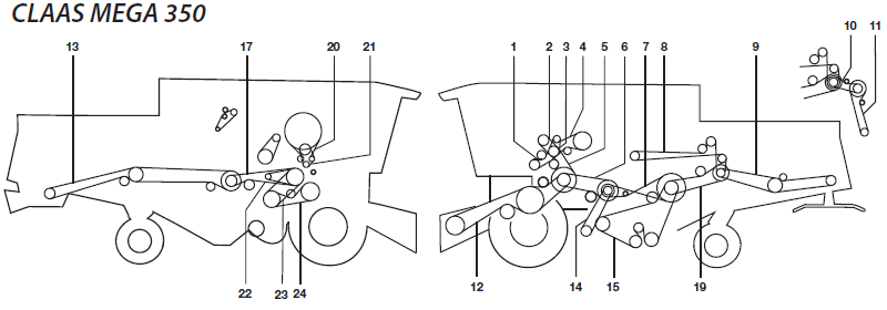 Ремни на комбайн Claas Mega-350 схема ремней комбайна Клаас Мега 350