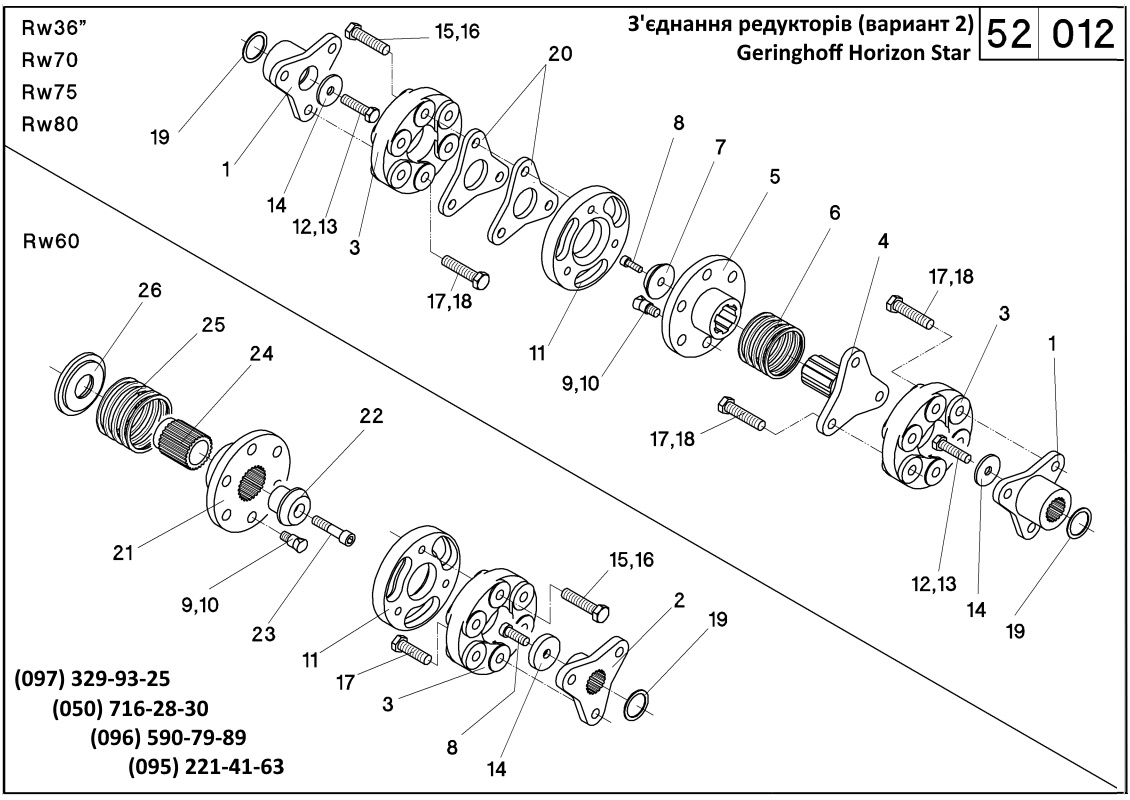 11 001870 шайба муфти еластичної 12 040455 болт M12x40 - DIN 933 13 040110 шайба гравер A12 - DIN 127 14 040343 шайба зпеціальна ø13/50x10 15 040660 болт M14x60 - DIN 931 10.9 16 040118 шайба гравер A14 - DIN 127 17 040659 болт M14x65 - DIN 931 18 040049 гайка M14 - DIN 985 19 040226 шайба регулювальна 35х45х1,0 20-26 -- -- на міжряддя 60см |