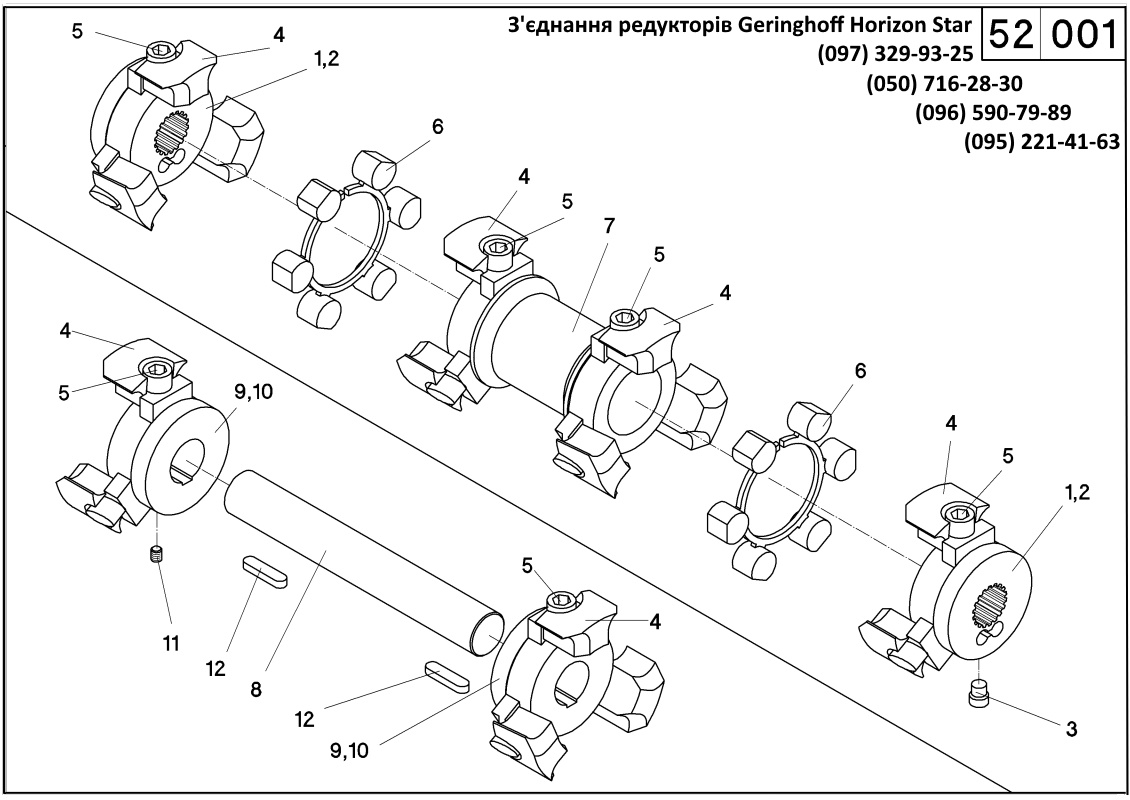 1 002063 ступиця еластичної муфти 2 002141 ступиця на міжряддя 60см 3 027103 еластична муфта 4 002141 ступиця з валом 5 501457 ступиця з шліцями 6 041931 пружина 7 501458 шайба спеціальна 8 040707 гвинт M12x35 - DIN 6912 9 626202 болт фіксації еластичної муфти 10 040010 гайка M12 - DIN 985 |