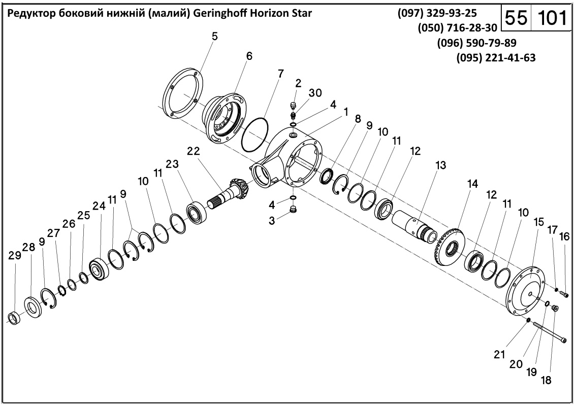 1 501700 корпус редуктора малого 2 040827 сапун M10x1 3 040850 пробка M18x1,5 - DIN 908 4 041297 шайба мідна 18x22x1,5 - DIN 7603 5 501707 прижимний фланец 6 501703 кришка 7 041299 кільце гумове 140х3,0 8 041274 сальник 45x62x7 9 041030 кільце стопорне W80x2,5 - DIN 472 10 040390 шайба регулювальна 70x80x0,1 - DIN 988 10 040391 шайба регулювальна 70x80x0,3 - DIN 988 10 040392 шайба регулювальна 70x80x0,5 - DIN 988 11 040389 шайба регулювальна 70x80x2 - DIN 988 12 025148 підшипник 32010 13 501702 вал 14 501709 шестерня Z=32 пара Z=15 14 501705 шестерня Z=32 пара Z=16 - bis Baujahr 2004 14 501714 шестерня Z=32 пара Z=17 - ab Baujahr 2005 15 501701 кришка 16 040530 гвинт M8x25 - DIN 912 |