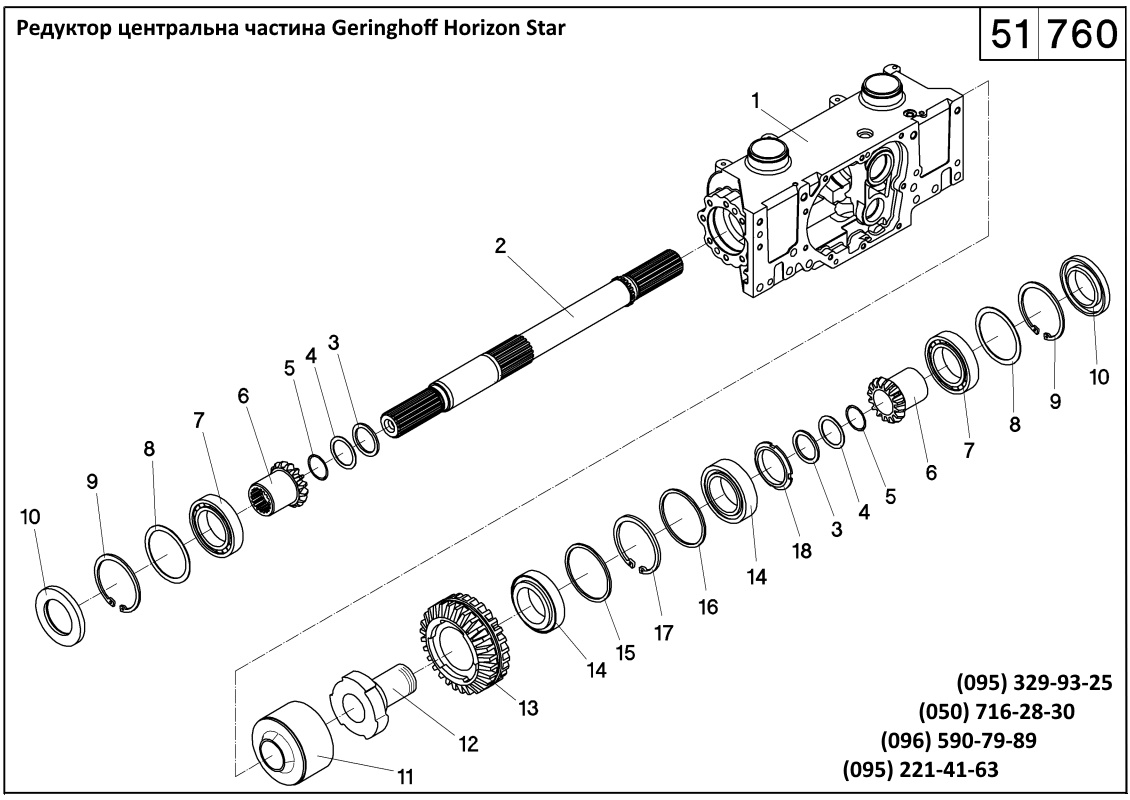 9 041030 кільце стопорне W80 - DIN 472 10 041466 сальник 50x80x8 11 502781 муфта запобіжна (трищітка) 12 502759 вісь 13 502785 шестерня Z32 14 025148 підшипник 32010 15 042128 шайба регулювальна 70x80x2,5 16 042118 шайба регулювальна 70x80x3,0 17 041531 кільце стопорне W80 - DIN 472 18 502788 гайка фіксації шестерні - 502767 комплект шестерен (502758 + (501798 - на схемі нема)) |