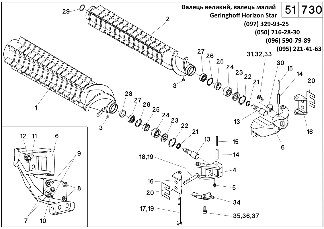 22 041194 кільце стопорне W40x1,75 - DIN 472 23 041193 ущільнення лаберінтне 17x40 LSTO 24 025104 підшипник 3203 2RS-C3 25 501105 гайка спеціальна 26 041150 кільце стопорне W35x1,5 - DIN 472 27 025103 підшипник 6202 2RS-C3 28 041935 заглушка 32 - DIN 442 29 041200 кільце гумове 30х2,0 30 501231 чистик 31 040437 болт мебельний M8x20 - DIN 603 32 040201 шайба гравер 8,4 - DIN 125 33 040008 гайка M8 - DIN 985 34 502851 чистик 35 040483 гвинт M10x20 - DIN 912 36 040202 шайба гравер 10,5 - DIN 125 37 040109 гайка A10 - DIN 127 - 502109 валець малий з підшипниками - 502100 валець малий з носком - 501085 валець великий з підшипниками - 502120 валець великий з носком |