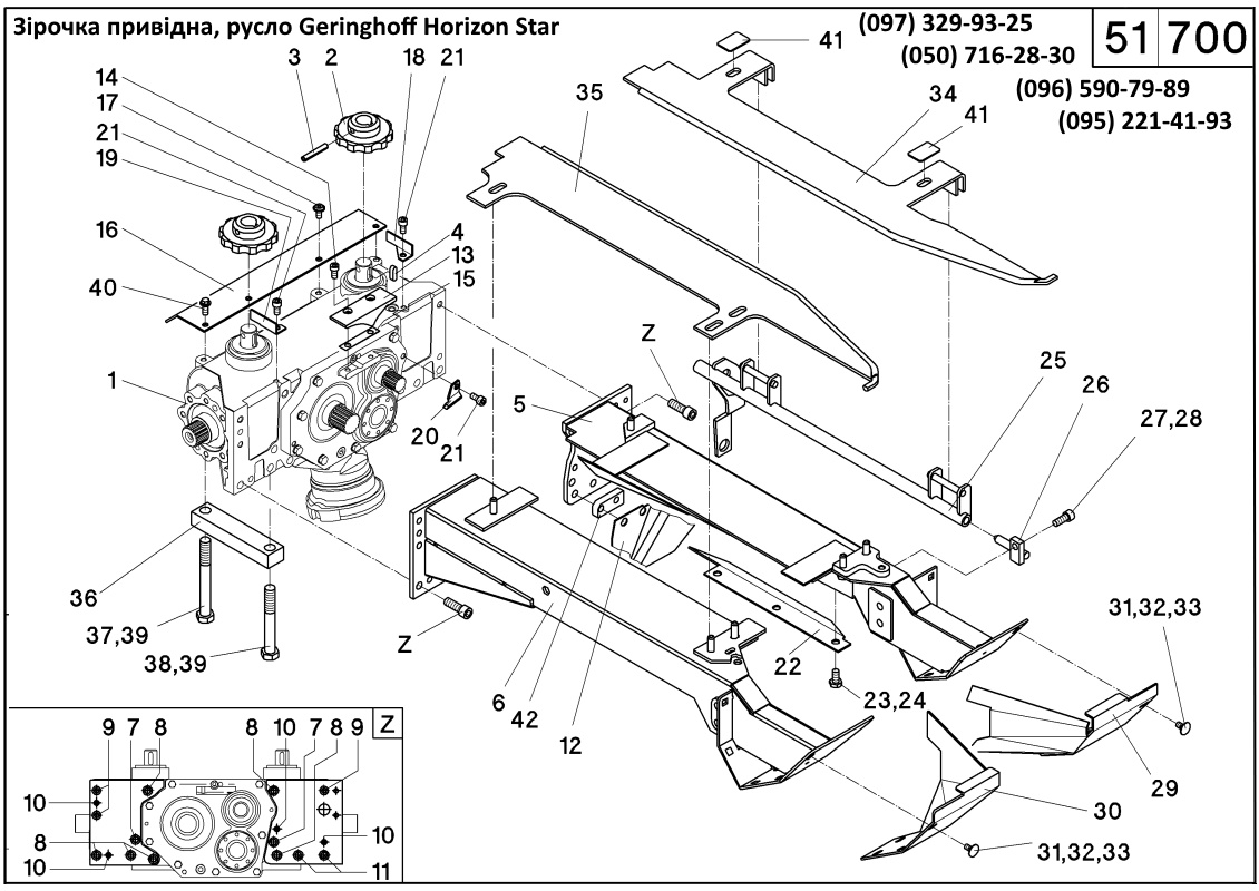 1 502795 редуктор в зборі Geringhoff Horizon Star 2 032027 зірочка привідна Z-10 (під шпонку) 3 041010 штифт розрізний 8x50 - DIN 1481 4 041042 шпонка 8x7x25 - DIN 6885 5 501009 рама русла ліва 6 501010 рама русла праве 7 040723 болт M12x30 - DIN 912 8 040724 болт M12x35 - DIN 912 9 040731 болт M10x25 - DIN 912 mvk 10 041199 штифт 10x20 - DIN 1481 11 042204 болт M12x50 - DIN912 mvk 12 501339 щиток 13 501230 чистик редуктора 14 040909 гвинт M8x16 - DIN 6912 15 501256 пластина регулюальна 16 501600 пластина захистна 17 040752 гвинт M8x16 - 10.9 18 501243 чистик лівий 19 501244 чистик правий 20 501241 чистик вальця 21 040547 гвинт M8x16 - DIN 912 22 -- -- -- Rw 50/55/20"/22" |