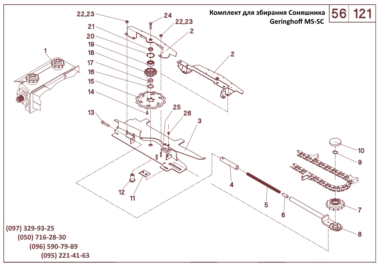 1 032012 зірочка привідна Z10 2 501981 кронштейн кріплення ножа 2 501979 кронштейн Klapphaube 3 501983 пластина для збору соняшника 4 501924 захист натяжної пружини 5 041956 пружина натяжної зірочки 6 501937 палець 7 034851 зірочка натяжна Z17 8 501221 кронштейн натяжної зірочки 9 041015 кільце стопорне Z30x1,5 - DIN 471 10 041242 кришка натяжної зірочки 11 501217 пластина терття 12 501994 палецю ножа 13 040805 гввинт M12x55 - DIN 912 14 040639 гвинт M8x16 - DIN 799 15 501985 ніж дисковий |