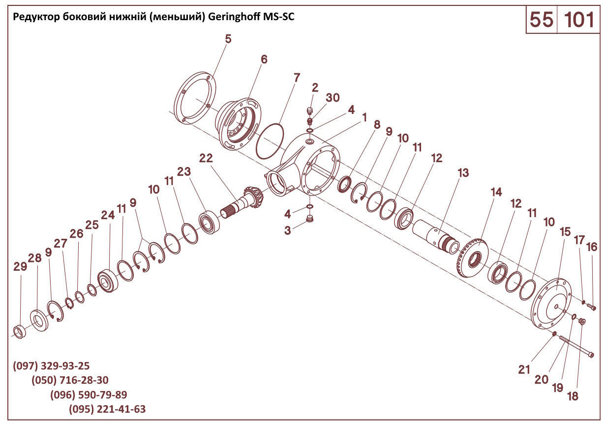 1 501700 корпус редуктора Герінгофф 2 040827 сапун M10x1 3 040850 пробка M18x1,5 - DIN 908 4 041297 шайба 18x22x1,5 - DIN 7603 5 501707 фланец прижимний 6 501703 кришка редуктора 7 041299 кільце гумове 140х3,0 8 041274 сальник 45x62x7 9 041030 кільце стопорне W80x2,5 - DIN 472 10 040390 шайба регулювальна 70x80x0,1 - DIN 988 10 040391 шайба регулювальна 70x80x0,3 - DIN 988 10 040392 шайба регулювальна 70x80x0,5 - DIN 988 11 040389 шайба регулювальна 70x80x2,0 - DIN 988 12 025148 підшипник 32010 13 501702 вал 14 501709 шестерня Z=32 / Z=15 14 501705 шестерня Z=32 / Z=16 - bis Baujahr 2004 14 501714 шестерня Z=32 / Z=17 - ab Baujahr 2005 15 501701 кришка 16 040530 гвинт M8x25 - DIN 912 |
