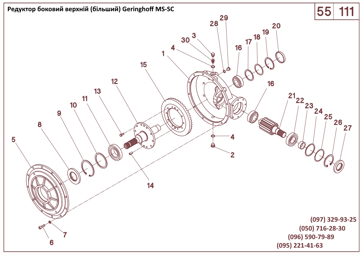 18 040394 шайба регулювальна 60x72x0,1 - DIN 988 18 040395 шайба регулювальна 60x72x0,3 - DIN 988 18 040396 шайба регулювальна 60x72x0,5 - DIN 988 19 041019 кільце стопорне W72x2,5 - DIN 472 20 041301 заглушка 72 - DIN 442 21 501753 шестерня Z16 22 025152 підшипник 32208 23 501706 втулка сальника 45x16,5 24 040389 шайба регулювальна 70x80x2 - DIN 988 25 040390 шайба регулювальна 70x80x0,1 - DIN 988 25 040391 шайба регулювальна 70x80x0,3 - DIN 988 25 040392 шайба регулювальна 70x80x0,5 - DIN 988 26 041030 кільце стопорне W80x2,5 - DIN 472 27 041272 сальник 45x80x10 28 040296 шайба 18x14x1,3 - DIN 7603 29 040878 пробка M14x1,5 - DIN 908 30 040908 штуцер-перехідник M18x1,5 / M10x1 - 501580 редуктор в зборі Z32 - 501581 редуктор в зборі Z34 - 501589 редуктор в зборі Z37 - 501591 редуктор в зборі Z40 - 501590 редуктор в зборі Z42 - 501582 редуктор в зборі Z44 - 501583 редуктор в зборі Z47 - 501584 редуктор в зборі Z50 - 501585 редуктор в зборі Z53 - 501586 редуктор в зборі Z56 - 501587 редуктор в зборі Z60 - 501588 редуктор в зборі Z64 |