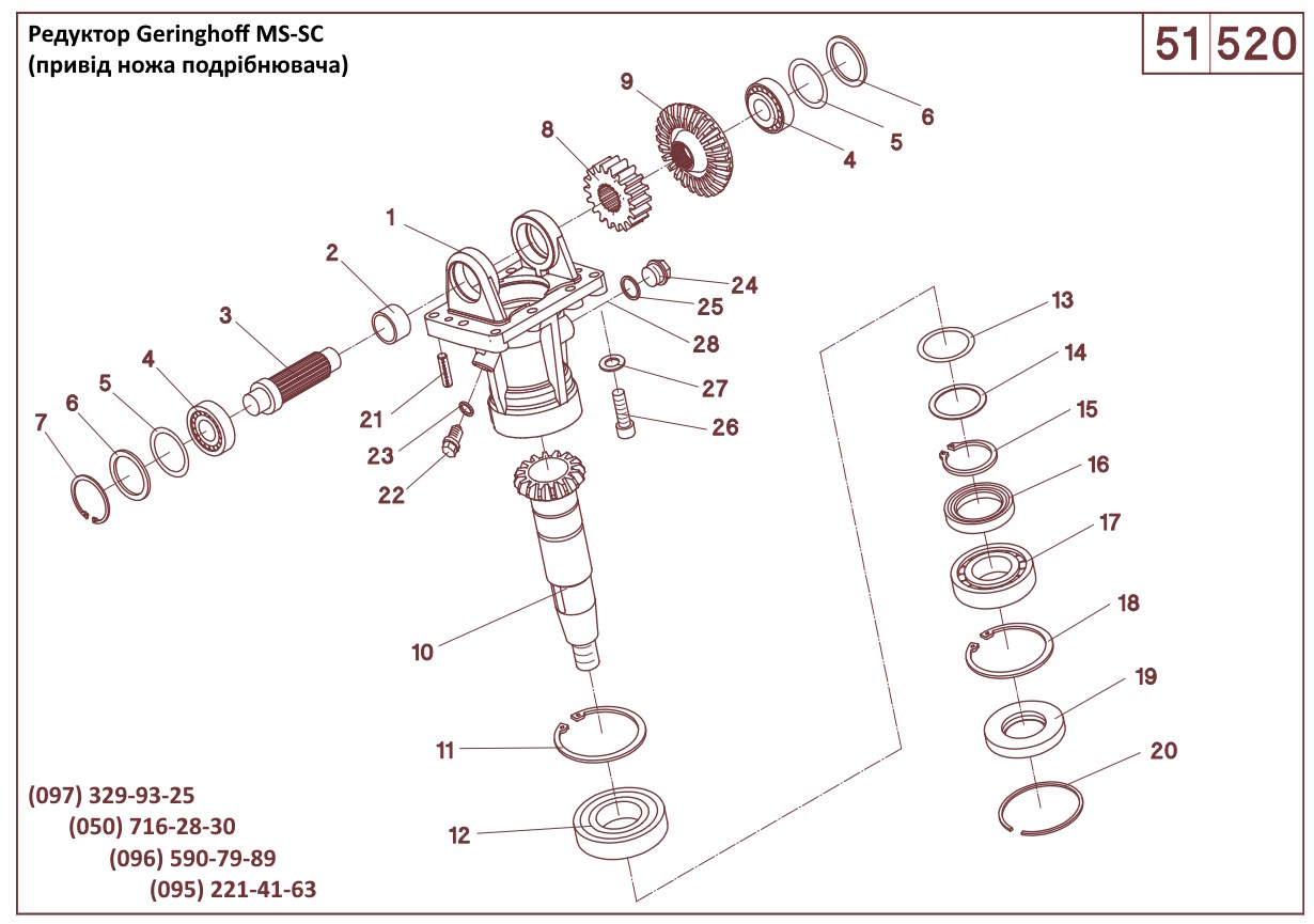 1 502742 корпус привода ножів 2 502747 втулка 30/17 3 502744 вал шліцевий 4 025238 підшипник 30204 5 040174 шайба регулювальна 37x47x0,1 - DIN 988 5 042114 шайба регулювальна 37x47x0,3 - DIN 988 5 040199 шайба регулювальна 37x47x0,5 - DIN 988 6 042113 шайба регулювальна 37x47x2,5 - DIN 988 7 041211 кільце стопорне W47x1,75 - DIN 472 8 502745 шестерня прямозуба Z18 9 502739 шестерня косозуба Z23 10 502743 вал-шестерня Z13 11 041030 кільце стопорне W80x2,5 - DIN 472 12 025171 підшипник 6208 13 040350 шайба регулювальна 40x50x0,1 - DIN 988 13 040351 шайба регулювальна 40x50x0,3 - DIN 988 13 040352 шайба регулювальна 40x50x0,5 - DIN 988 |