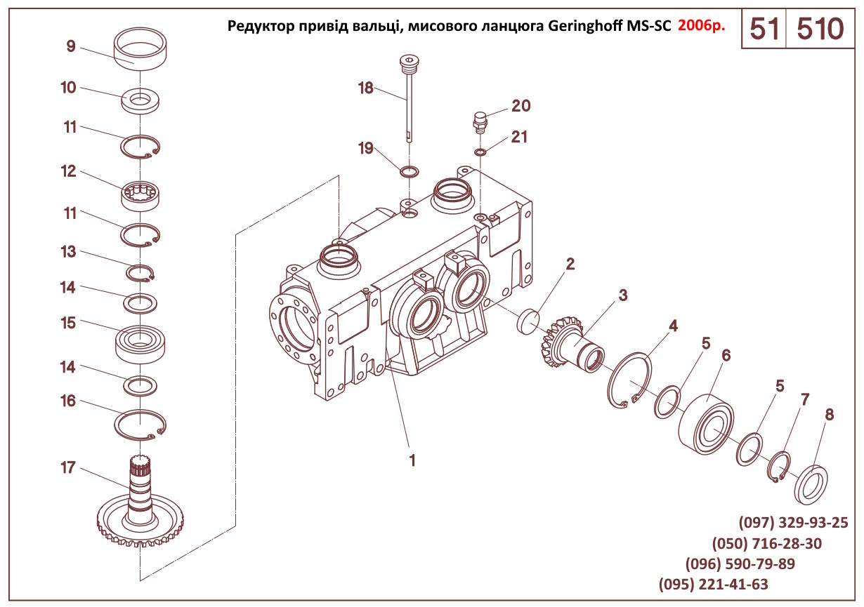1 502748 корпус редуктора Geringhoff Mais Star 2 041305 заглушка 32 - DIN 442 3 502741 шестерня привода вальців Z24 4 041019 кільце стопорне W72x2,5 - DIN 472 5 040186 шайба 35 6 025176 підшипник 3207C3 7 041145 кільце стопорне Z35x2,5 - DIN 471 8 041350 сальник 35x52x7 9 502310 втулка захистна 66/20,5 10 041528 сальник 25x47x7 11 041370 кільце стопорне W47 -DIN 472 12 025177 підшипник роликовий NU204E |