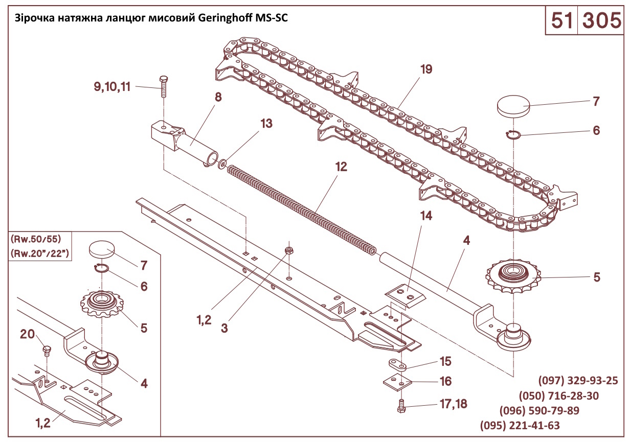 12 041959 пружина 13 040212 шайба 10,5 - DIN 7349 14 501217 пластина напраляюча (тертя) 15 501224 направляюча ричаг натяжної зірочки 16 501225 пластина фіксатор ричага 17 040418 болт M10x25 - DIN 933 18 040109 гайка A10 - DIN 127 19 034851 ланцюг мисоий 76 ланок 20 040582 болт M10x16 - DIN 933 - 501253 натяжний механізм лівий (поз.1-14) - 501254 натяжний механізм правий (поз.1-14) - 501834 натяжний механізм лівий (поз.1-14) end - 501835 натяжний механізм правий (поз.1-14end |