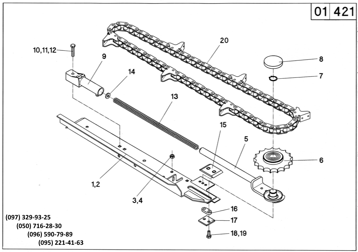13 041956 пружина 14 040212 шайба 10,5 - DIN 7349 15 501217 пластина сковзання 16 501224 направляюча натяжної зірочки 17 501225 пластина 18 040418 болт M10x25 - DIN 933 19 040109 шайба A10 - DIN 127 20 034851 ланцюг мисовий 76 ланок - 032013 кронштейн в зборі (поз.5,7) - 501220 кронштейн в зборі (поз.4,7) - 501253 механізм натяжний в зборі лівий (поз.1, 3-18 ) - 501254 механізм натяжний в зборі правий (поз.2-18 ) |