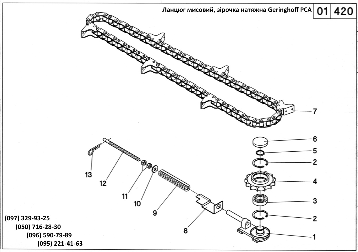 7 034850 ланцюг мисовий 72 ланки 8 001632 кронштейн 9 001103 пружина натяжної зірочки 10 040230 шайба 12,5x32x3 11 040016 гайка M12 - DIN 934 12 001124 гвинт різьбовий М12х210 13 041118 шплінт 5мм |