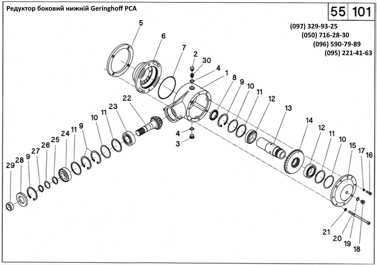 1 501700 корпус редуктора нижній (малий) 2 040827 мапун М10х1 3 040850 пробка зливна M18x1,5 - DIN 908 4 041297 шайба 18x22x1,5 - DIN 7603 5 501707 прижимний фланец 6 501703 кришка 7 041299 кільце гумове 140х3,0 8 041274 сальник 45x62x7 9 041030 кільце стопорне W80x2,5 - DIN 472 10 040390 шайба регулювальна 70x80x0,1 - DIN 988 10 040391 шайба регулювальна 70x80x0,3 - DIN 988 10 040392 шайба регулювальна 70x80x0,5 - DIN 988 11 040389 шайба регулювальна 70x80x2 - DIN 988 12 025148 підшипник 13 501702 вал 14 501705 шестерня Z=32 Z=16 - bis Baujahr 2004 14 501714 шестерня Z=32 Z=17 - ab Baujahr 2005 15 501701 кришка 16 040530 гвинт M8x25 - DIN 912 |