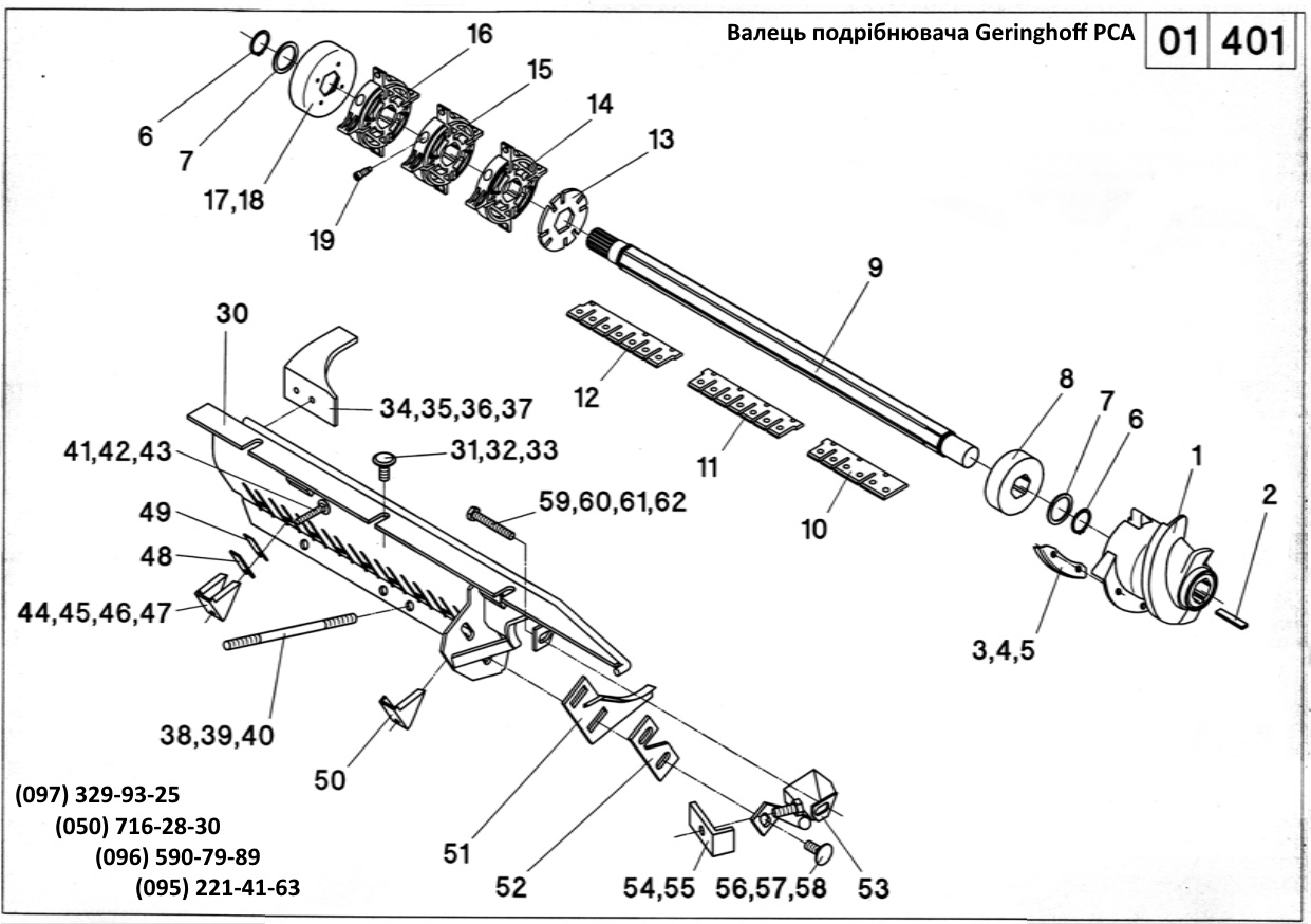 1 001260 шнек вальця 2 041075 шпонка шнека 3 001461 ніж ротора (банан) 4 040548 болт M8x16 - DIN 933 5 040114 шайба A8,4 - DIN 6798 6 041054 кільце стопорне 32x2 - DIN 471 7 040227 шайба регулювальна 35x45x0,5 - DIN 988 7 040227 шайба регулювальна 35x45x1,0 - DIN 988 7 040227 шайба регулювальна 35x45x2,0 - DIN 988 8 001850 сегмент шнека (пластіковий) 9 002025 вал шестигранний 10 001486 ніж передній 11 001485 ніж середній 12 002040 ніж задній 13 001492 пластина захистна 14 001491 сегмент передній (2шт - на вал) 15 001482 сегмент середній (16шт - на вал) 16 002026 сегмент задній (1шт - на вал) 17 002028 захист пластиковий 18 040655 саморіз 4х30 19 040594 гвинт кріплення ножа 30 001466 корпус PCA 31 040410 гвинт M12x30 32 040230 шайба 12,5x32x3 33 040010 гайка M12 - DIN 985 34 001072 чистик задній 35 040472 болт M10x20 - DIN 933 |