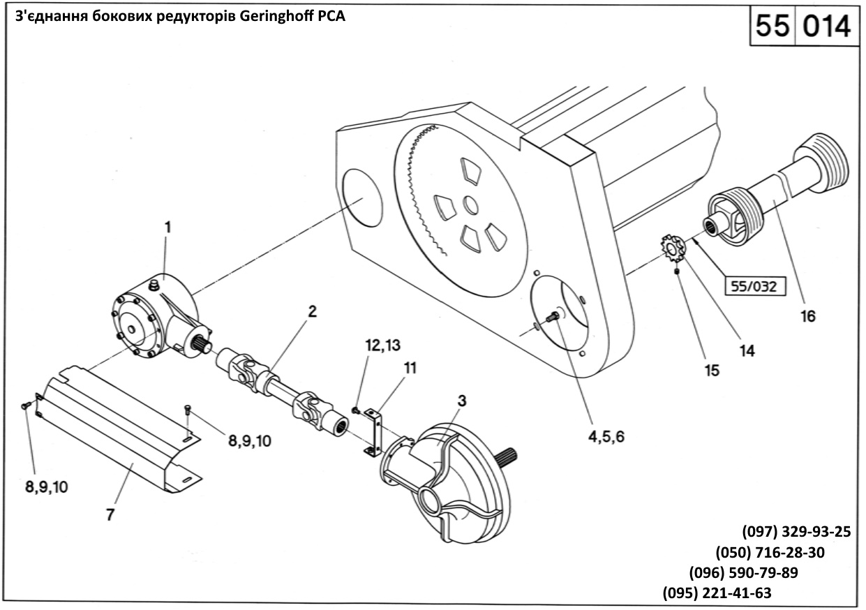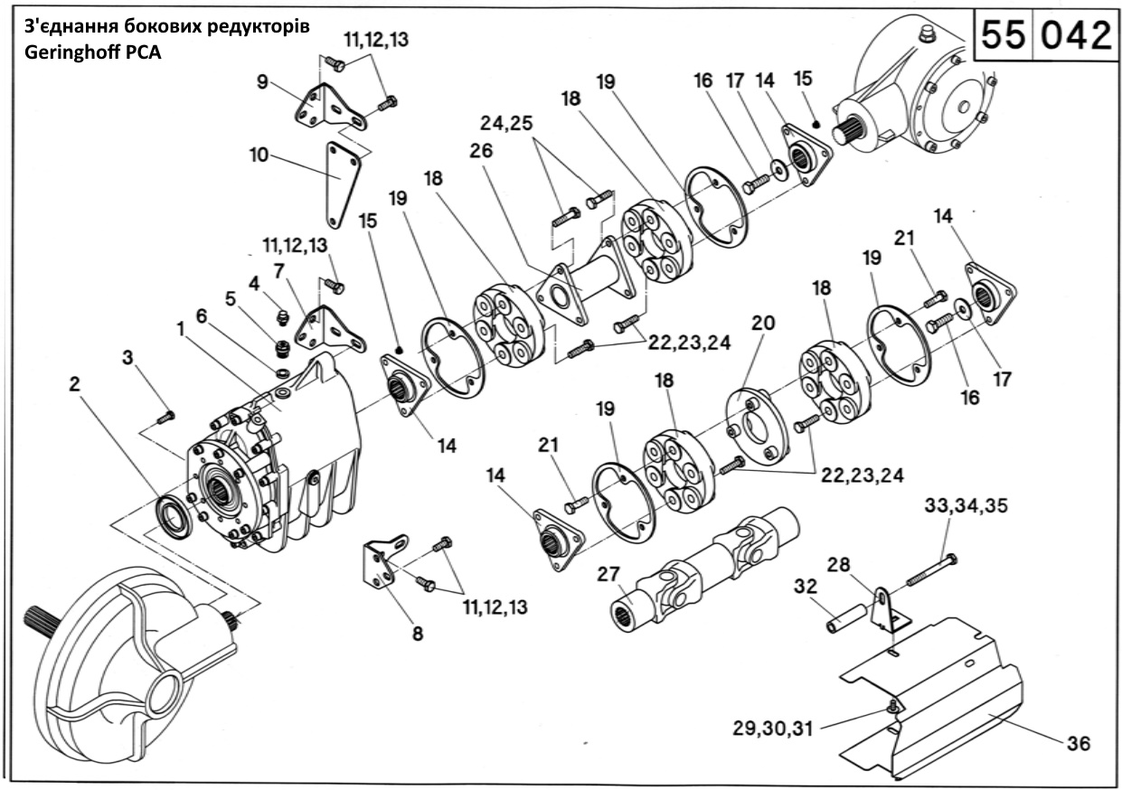 1 501575 редуктор нижній (малий) 2 023785 вал карданний (з'єднання редукторів) W2300-Lz189 4 040427 болт M12x25 - DIN 933 5 040110 шайба A12 - DIN 127 6 040218 шайба 13 - DIN 9021 7 527251 захист 514мм 8 040448 болт M8x25 - DIN 933 9 040108 шайба гравер A8 - DIN 127 10 040201 шайба 8,4 - DIN 125 11 527268 скоба 12 040444 болт M8x20 - DIN 933 13 040108 шайба гравер A8 - DIN 127 14 030111 шестерня привода шнека Z=11-3/4" Claas, MF, GL 14 030101 шестерня привода шнека Z=13-3/4" Claas, JF, MF 14 030102 шестерня привода шнека Z=15-3/4" NH, Case 14 030108 шестерня привода шнека Z=16-3/4" JD, Case 14 030103 шестерня привода шнека Z=17-3/4" DF, MF 14 030104 шестерня привода шнека Z=19-3/4" NH 14 030106 шестерня привода шнека Z=23-3/4" MF 15 040722 штіфт M10x10 - DIN 916 16 023865 вал карданний на жатку Geringhoff W2400-Lz1110 - 21t / 6t під хрест.32х76 16 023807 вал карданний на жатку Geringhoff W2400-Lz910 - 21t / 21t під хрест.32х76 16 023808 вал карданний на жатку Geringhoff W2400-Lz1110 - 21t / 21t під хрест.32х76 16 023832 вал карданний на жатку Geringhoff W2400-Lz1310 - 21t / SW28,6 під хрест.32х76 16 023863 вал карданний на жатку Geringhoff W2400-Lz1110 - 21t / SW3 під хрест.32х76 16 023973 вал карданний на жатку Geringhoff W2500-Lz1110 - 21t / 6t під хрест.36х89 16 023972 вал карданний на жатку Geringhoff W2500-Lz910 - 21t / 6t під хрест.36х89 ЗАПЧАСТИНИ на кардани під хрестовину 32х76 ЗАПЧАСТИНИ на кардани під хрестовину 36х89 |