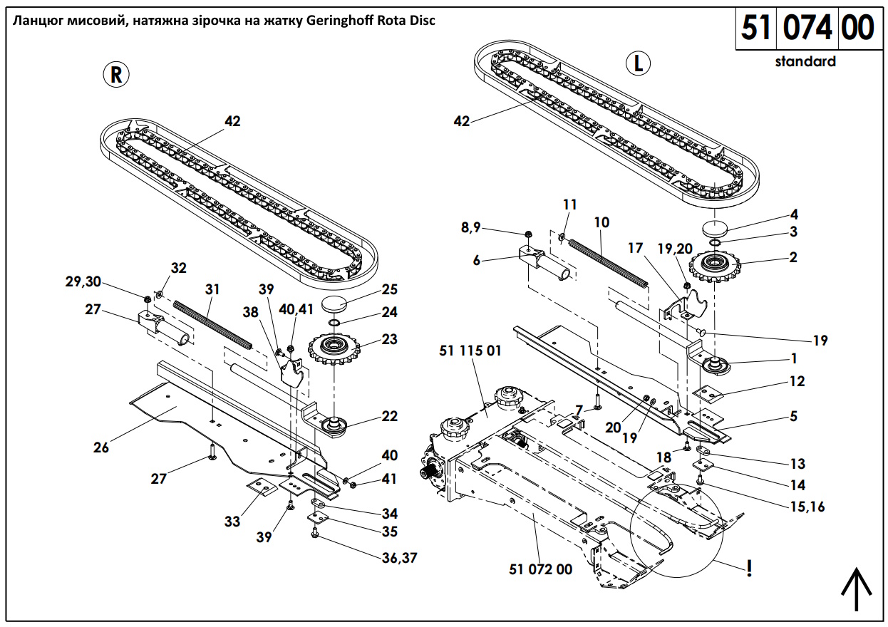 22 501833 кронштейн натяжної зірочки правий 23 032012 зірочка натяжна Z17 24 041015 кільце стопорне Z30х1,5 DIN471 25 041242 кришка натяжної зірочки 26 5501116 направляюча дека ланцюга права 2012р 27 501226 упор пружини натяжника пластиковий 502169 28 040608 болт мебельний M10x50 8.8 DIN603 29 040202 шайба гравер A10,5 DIN125 30 040009 гайка M10 DIN985 31 041956 пружина натяжної зірочки 32 040212 шайба 10,5 DIN7349 33 501217 пластина тертя мисового ланцюга 34 501224 направляюча пластина 22х9х50 35 501225 пластина 50х50х5 36 040544 болт M10x25 8.8 DIN933 37 040231 шайба 10,2x22,25x2,75 DIN152 38 5501127 упор капота правий 39 040499 болт мебельний M10x25 DIN603 40 040202 шайба A10,5 DIN125 41 040009 гайка M10 DIN985 42 034859 ланцюг мисовий (або 034851) |