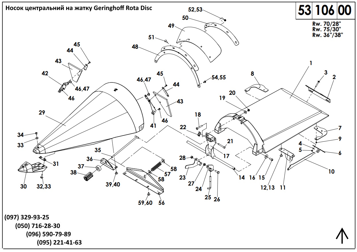 29 504010 носок (rot - червоний) 29 504013 носок (grün - зелений) 29 504016 носок (gold-gelb - золотисто-жовтий) 29 507004 носок (signal-gelb - сигнальний жовтий) 29 504684 носок (silber-grau - сріблясто-сірий) 29 505732 носок (blutorange - оранжевий) 30 504033 накінечник носка (жовтий - 504031) 30 504034 накінечник носка (чорний - 504032) 31 504164 пластина кріплення накінечника 32 040528 болт M8x30 DIN933 33 040216 шайба A8,4 DIN9021 34 040917 болт М8х20 35 503198 шток носка 36 504023 кронштейн штока носка 37 504026 гумовий амортизатор носка (втулка) 38 503199 ручка регулюання 39 040548 болт M8x16 DIN933 40 040216 шайба A8,4 DIN9021 504182 уловлювач качана в зборі (поз.41-47) 41 504180 кронштейн уловлювача качана - лівий 42 504181 кронштейн уловлювача качана - правий 43 003154 уловлювач качана - (гумовий) 44 504169 планка 45 040725 болт M8x14 DIN933 46 040534 болт M8x16 DIN933 47 040216 шайба A8,4 DIN9021 504800 фартух передній в зборі (поз.48-55) 48 504801 планка 49 504804 фартух передній 50 504788 пластина 51 040486 болт мебельний M8x30 DIN603 52 040201 шайба A8,4 DIN125 53 040008 гайка M8 DIN985 54 040534 болт M8x16 DIN933 55 040201 шайба A8,4 DIN125 504037 кріплення носка в зборі (поз.56-60) 56 504023 кронштейн 57 041990 пружина 4x26x125, n=12 D329 B05 58 040218 шайба A13 DIN9021 59 040604 болт M8x20 DIN933 60 040216 шайба 8,4 DIN9021 |