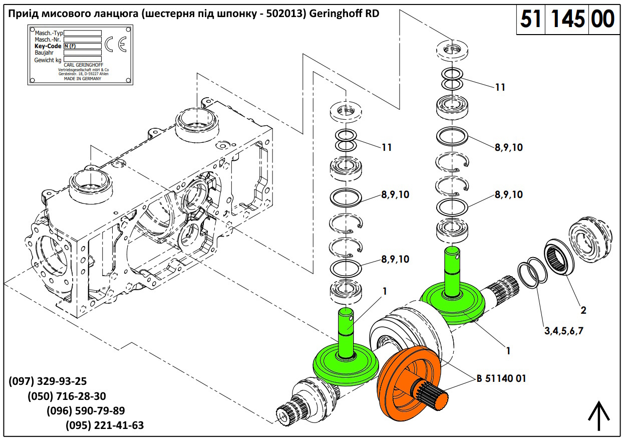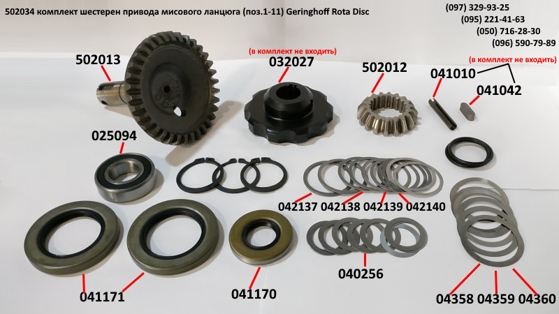 8 040358 шайба регулюальна 42x52x0,1 9 040359 шайба регулюальна 42x52x0,3 10 040360 шайба регулюальна 42x52x0,5 11 040256 шайба регулюальна 25x35x1,0 502034 комплект шестерен привода мисового ланцюга (поз.1-11) |