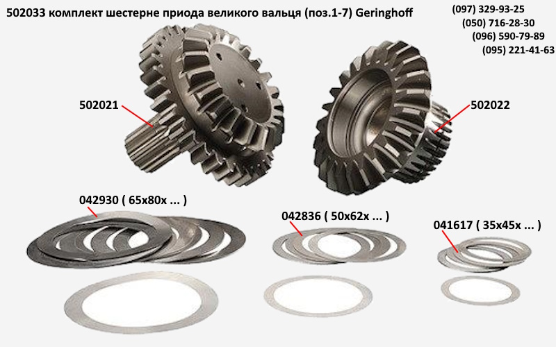 502033 комплект шестерне приода великого вальця (поз.1-7) 1 502021 шестерня (привода великого вальця) 2 502022 шестерня (з'єднується з муфтою) 3 042930 шайба регулювальна 65x85x0,1 DIN988 ------ шайба регулювальна 65x85x0,15 ------ шайба регулювальна 65x85x0,3 ------ шайба регулювальна 65x85x0,5 4 042931 шайба регулювальна 65x85x1,0 |