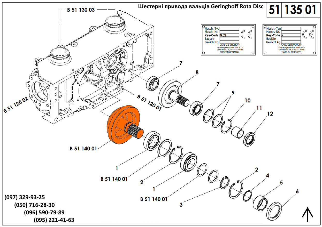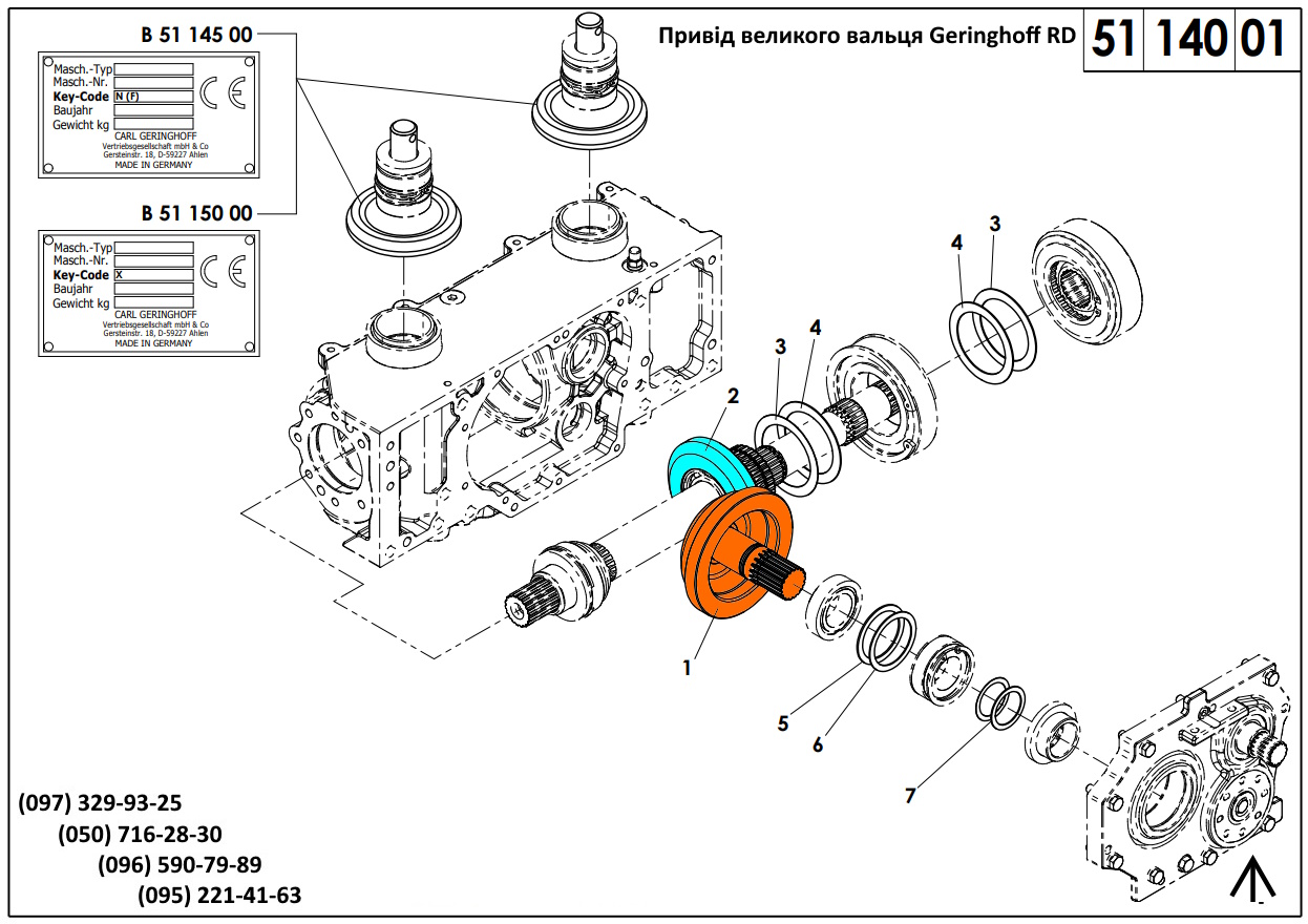 5501500 редуктор центральний в зборі Geringhoff 1 025147 підшипник 32007 2 042806 кільце стопорне W62 DIN472 3 041145 кільце стопорне Z35x2,5 DIN471 4 041532 кільце SW35 5 502794 втулка сальника (великого вальця) 6 042805 сальник 45x62x7 B1SL (великого вальця) DIN3760 |