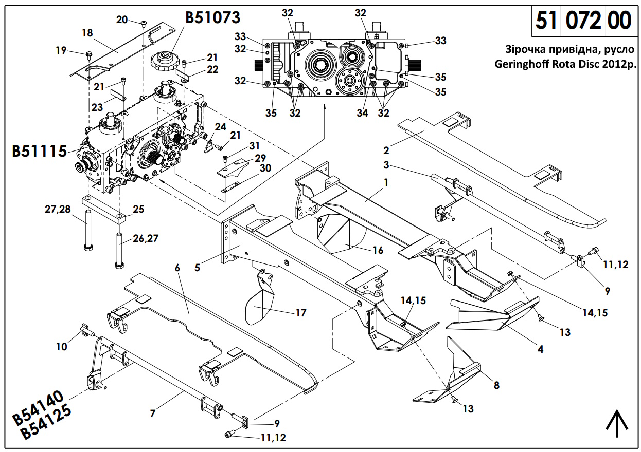 19 040764 болт М8х20 20 040752 гвинт M8x16 10.9 21 040547 гвинт M8x16 DIN912 22 501243 чистик лівий 23 501244 чистик правий 24 501241 чистик вальця 25 002030 планка кріплення редуктора 26 040718 болт M16x120 DIN931 27 040248 шайба A16,5 DIN6798 28 040681 болт M16x140 DIN931 29 501230 чистик вальців задній 30 501256 пластина регулювальна 31 040909 гвинт M8x16 DIN6912 32 040724 гвинт M12x35 DIN912 33 040731 гвинт M10x25 DIN912 34 040723 гвинт M12x30 DIN912 35 041199 шпифт 10x20 DIN1481 B52073 (дивися нижче) |