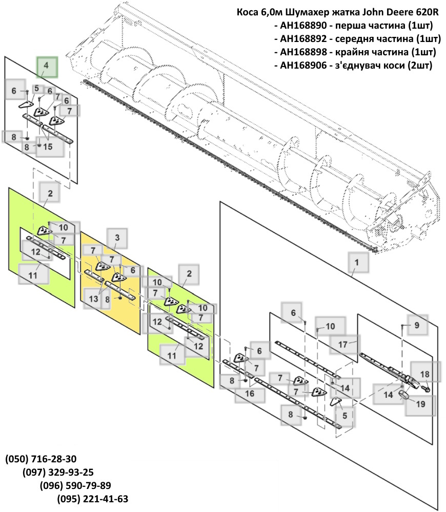 1 коса перша частина AH168890 2 зєднуач коси AH168906 3 коса середня частина AH168892 4 коса кінцеа частина AH168898 5 напів сегмент H202522 6 болт сегмента М6х16 H207542 7 сегмент (крупна насічка) Z93077 8 гайка сегмента флянцева М6 14M7303 9 болт сегмента голоки ножа М6х28 19M7580 10 болт сегмента голоки ножа М6х18 19M8625 |