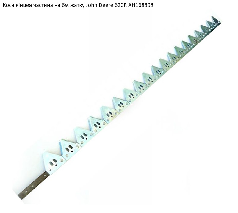 | Коса на жатку John Deere 620R 6,0м ШУМАХЕР - сегмент крупна насічка AH168890 - перша частина (1шт) + AH168892 - середня частина (1шт) + AH168900 - крайня частина (1шт) AH168898 - з'єднувач коси (2шт) |