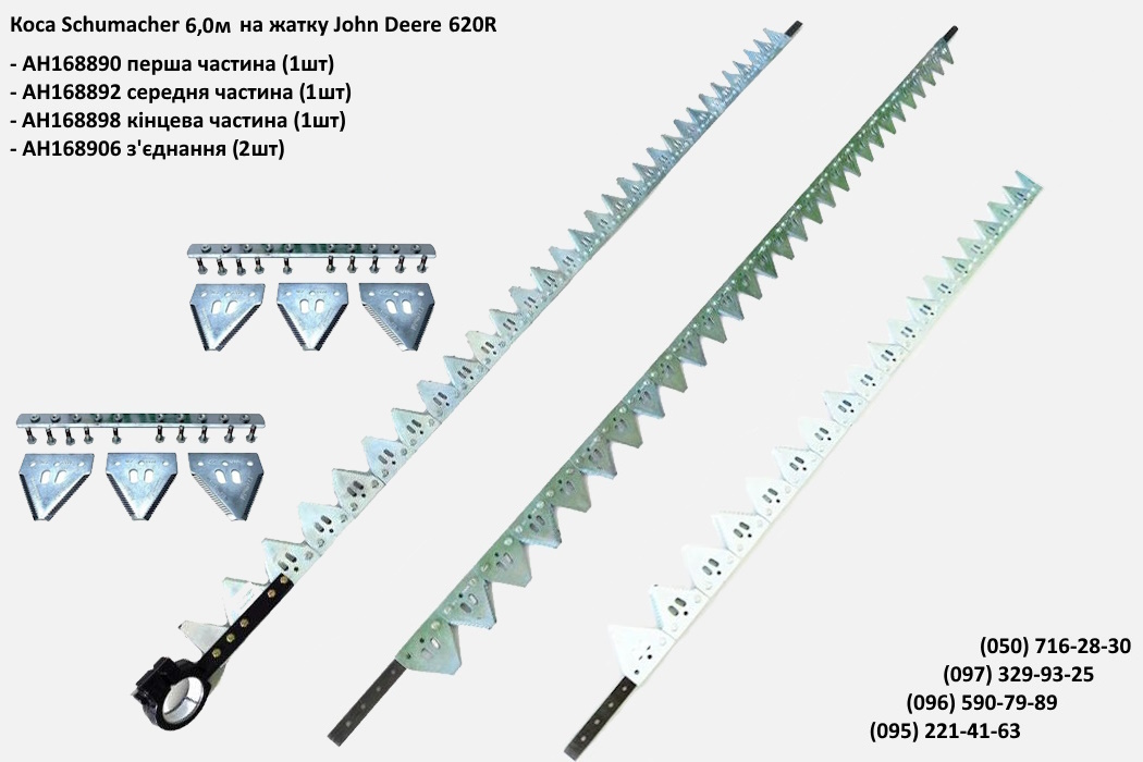 | Коса на жатку John Deere 620R 6,0м ШУМАХЕР - сегмент крупна насічка AH168890 - перша частина (1шт) + AH168892 - середня частина (1шт) + AH168898 - крайня частина (1шт) AH168906 - з'єднувач коси (2шт)