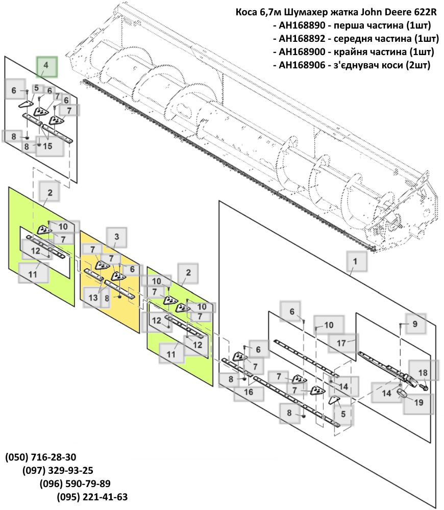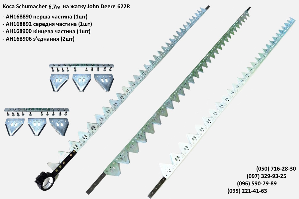 | Коса на жатку John Deere 622R 6,7м ШУМАХЕР - сегмент крупна насічка AH168890 - перша частина (1шт) + AH168892 - середня частина (1шт) + AH168900 - крайня частина (1шт) AH168906 - з'єднувач коси (3шт)