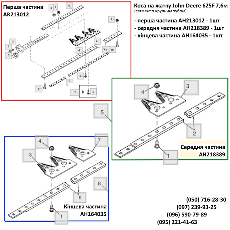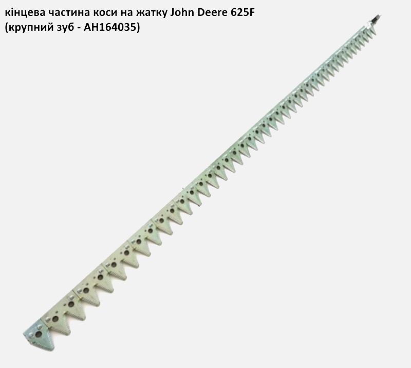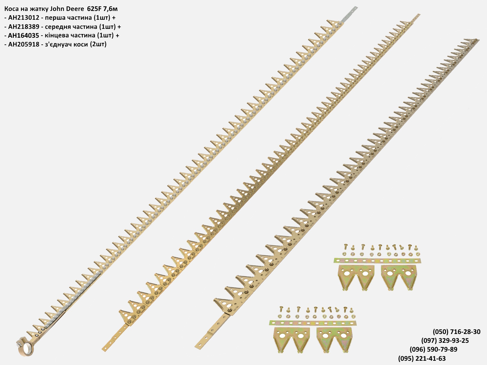 | Коса на жатку John Deere 625F 7,6м - подвійний сегмент крупна насічка AH213012 - перша частина (1шт) + AH218389 - середня частина (1шт) + AH164035 - крайня частина (1шт) AH205918 - з'єднувач коси (2шт) |