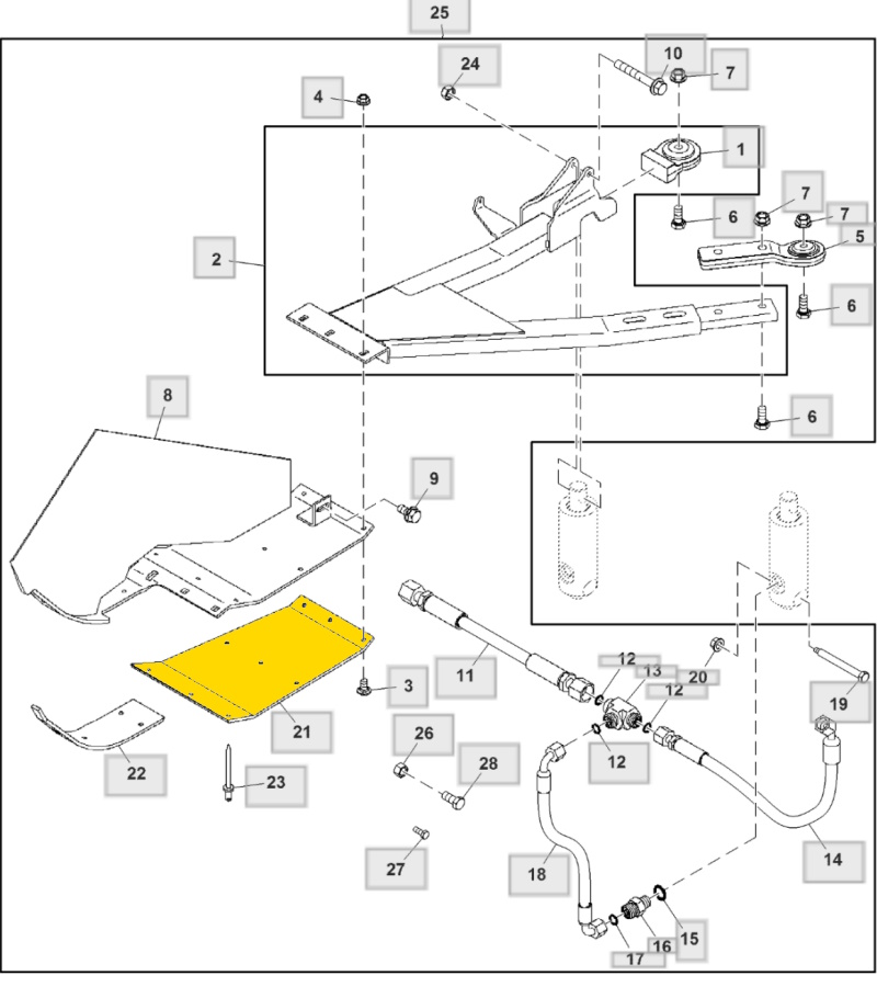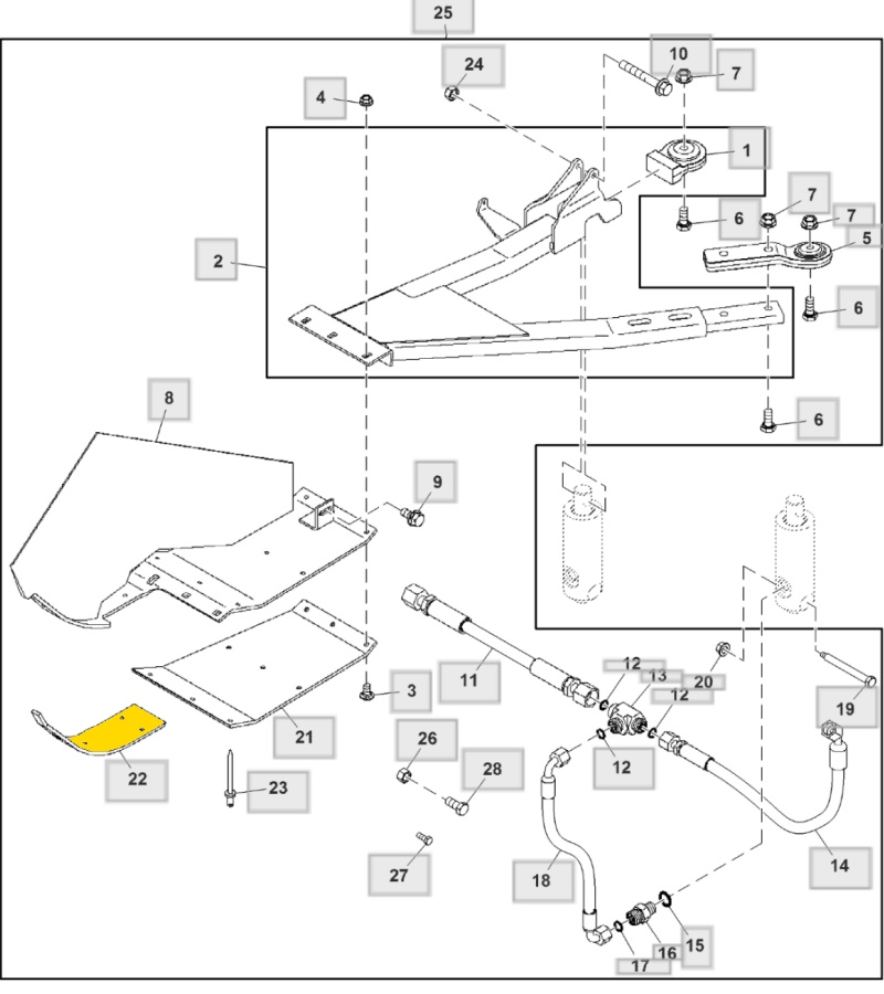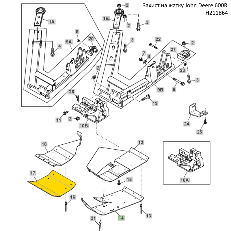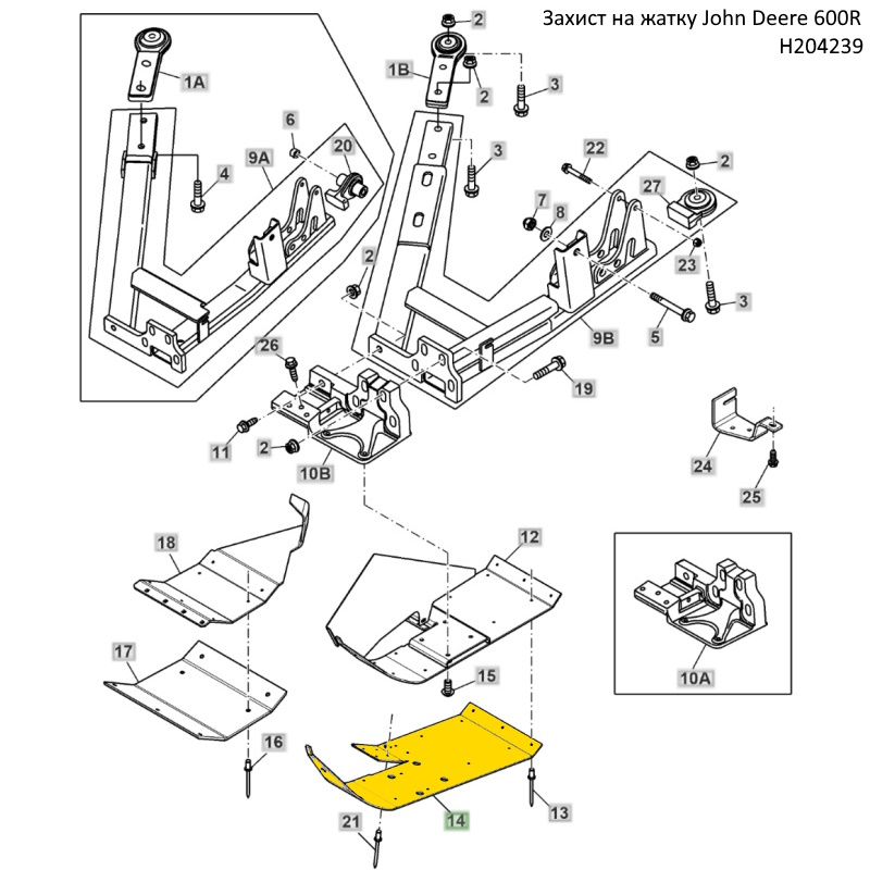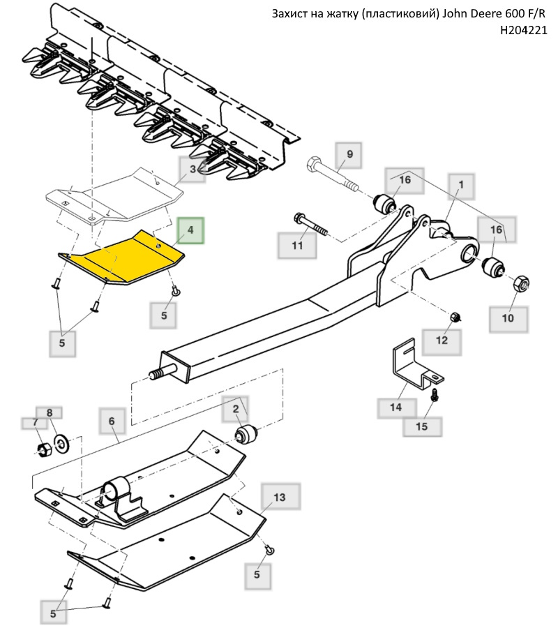 1 кронштейн AH220809 AH164238 OR AH212053 2 сайленблок AH154697 3 опорна пластина (металева) H204220 4 захист жатки (пластиковий) H204221 5 заклепка під молоток 1/4 Inch H150218 6 пластина опорна AH203962 7 гайка М16 14M7276 8 шайба 11/16" X 1-1/2" X 0.105" 24H1192 9 болт М12х150 H207478 10 гайка М12 14M7299 11 болт М10х70 19M7809 12 гайка М10 A51212 13 захист жатки (пластиковий) H204225 14 кронщтейн H204074 15 болт М10х20 37M7086 16 сайленблок AH230507 |