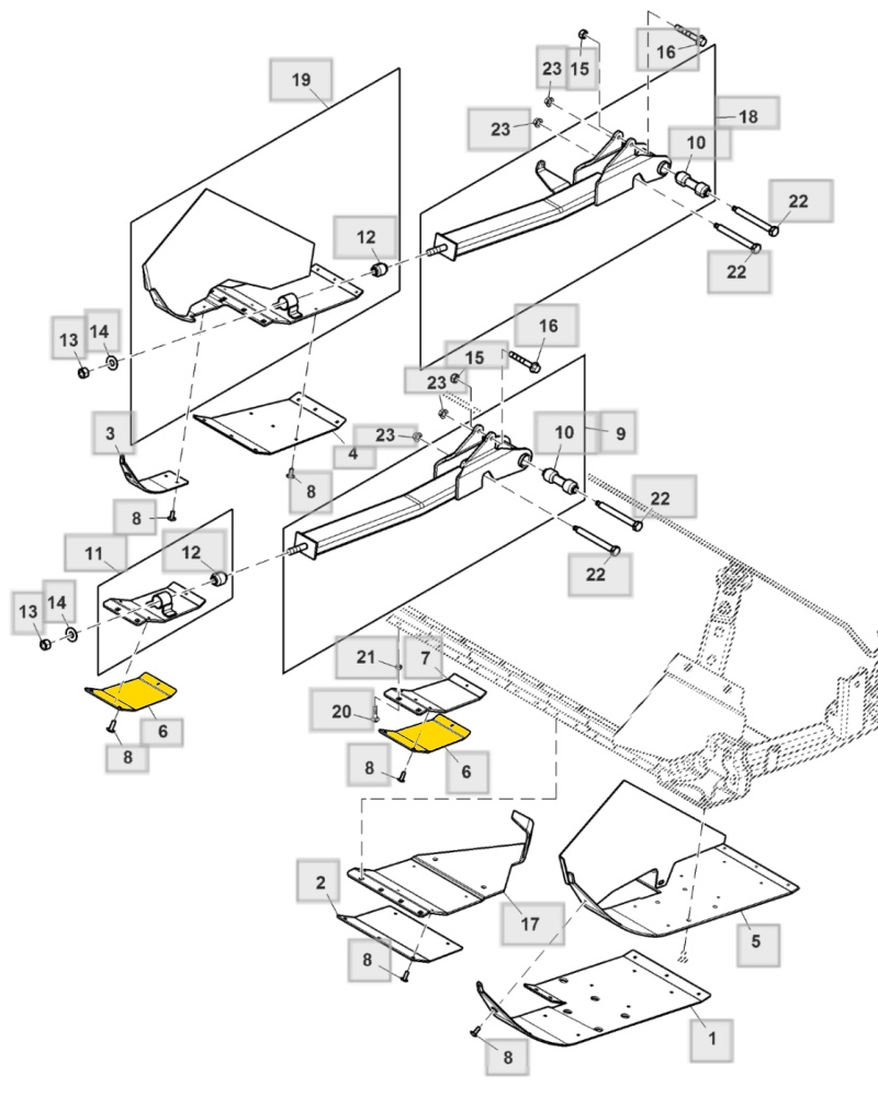 1 захист пластиковий лівий H215075 2 захист пластиковий лівий H208626 3 захист пластиковий правий H209696 4 захист пластиковвий правий H170501 5 плита опорна ліва AH167051 6 захист пластиковвий центральний 36шт - 618F - 620F H205344 6 захист пластиковвий центральний 40шт - 622F H205344 6 захист пластиковвий центральний 46шт - 625F H205344 6 захист пластиковвий центральний 56шт - 630F H205344 6 захист пластиковвий центральний 66шт - 635F H205344 7 опорна пластина центральна H205301 8 заклепка HXE52669, H150109 9 ричаг жатки лівий AH220809 10 сайліндлок ричага AH230507 11 опорна пластина ліва AH204994 - 618F 11 опорна пластина ліва AH204994 - 620F, 622F, 635F 11 опорна пластина ліва AH204994 - 625F 11 опорна пластина ліва AH204994 - 630F 12 сайлінблок опорної пластини AH154697 13 гайка M16 14M7276 14 шайба 24H1192 11/16" X 1-1/2" X 0.105" 15 гайка M10 A51212 16 болт M10х70 19M7809 17 упорна пластина (металева) H208616 18 ричаг жатки правий AH220811 19 захист боковий (металева) AH225233, AXE63566 19 захист боковий (металева) AXE63566 20 болт M10х40 03M7194 21 гайка M10 14M7296 22 болт M12х150 H207478 23 гайка M12 14M7299 |