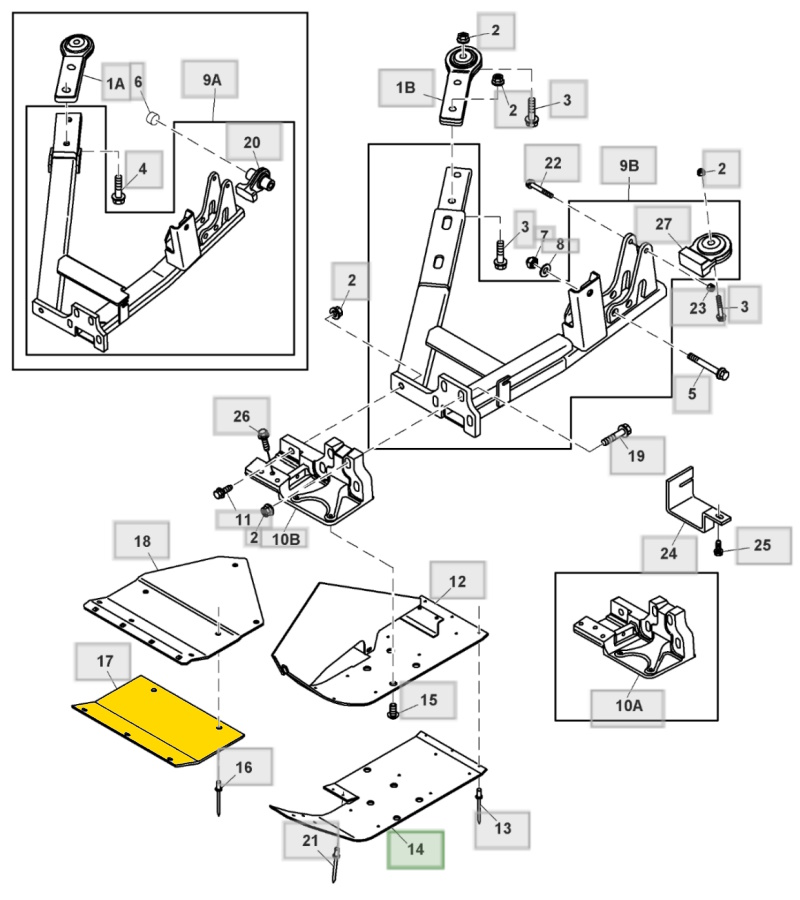 1A опора шарова стабілізатора жатки AH170774, AH206042 1B опора шарова стабілізатора жатки AH210858, AH210878 OR AH221021 OR AH221194 2 гайка М16 14M7291 3 болт М16х60 19M10822 4 болт М16х50 19M7794, AH206042 5 болт М16х130 19M7829 6 втулка A49465 7 гайка M16 A31869 8 шайба 11/16" X 1-1/2" X 0.105" 24H1192 9A стабілізатор жатки лівий AH210878, AH206042 OR AH221021 9B стабілізатор плаваючого ричага лівий AH225361, AH221194 9B стабілізатор плаваючого ричага лівий AH221194, AH221021 10A кронштейн H203906, H215074 10B кронштейн H215074 Remarks : ALSO ORDER H215589 618, H215588 620, H215587 622, H215586 625, H215584 630, H215585 635 11 болт М16х40 19M7793 12 пластина металева ліва AH203936 13 заклепка відривна 6.200 mm (0.244") HXE52669 14 захист лівий (пластиковий - під плавуючий ричаг) H204239, H203906 14 захист лівий (пластиковий) H218047, H215074 |